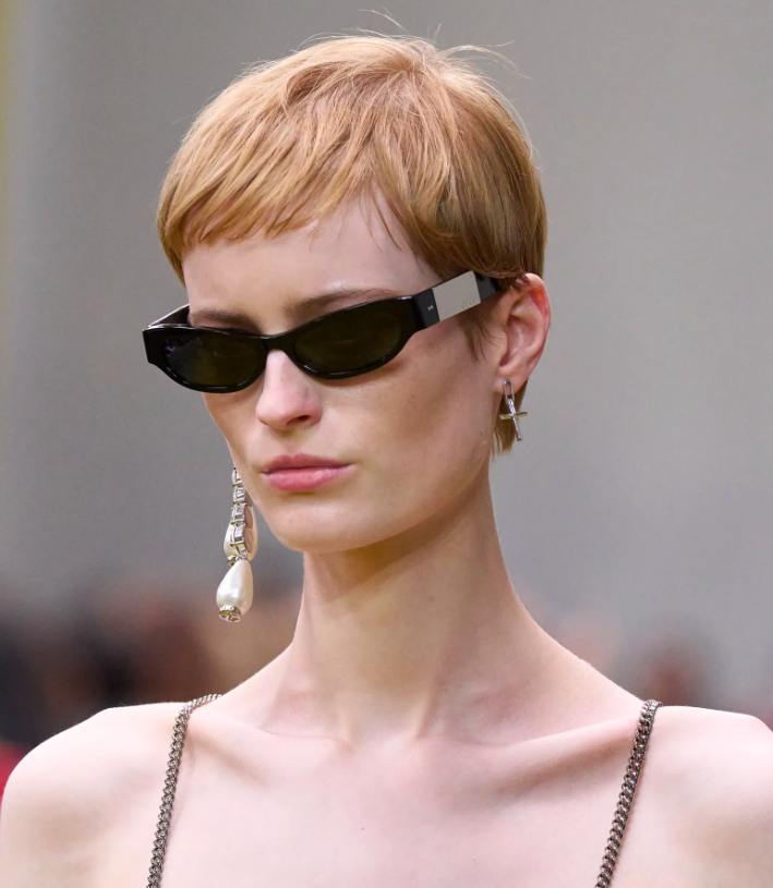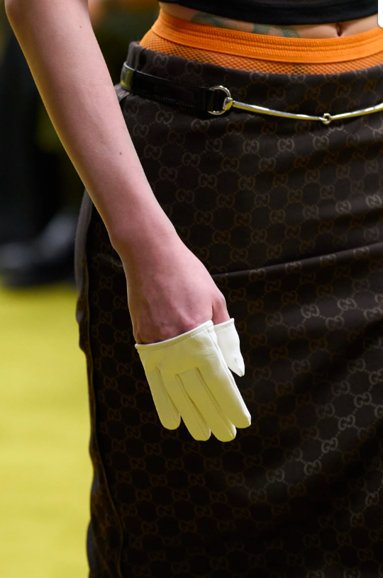 配飾部分同樣很有張力。彩色遮面太陽鏡致敬經典的古馳長頸瓶造型,為佩戴者呈現異色濾鏡下的世界;不對稱的單邊耳環,別緻耐看;各類彩色絲襪、僅包裹手指馬術手套,點綴出了GUCCI美學……