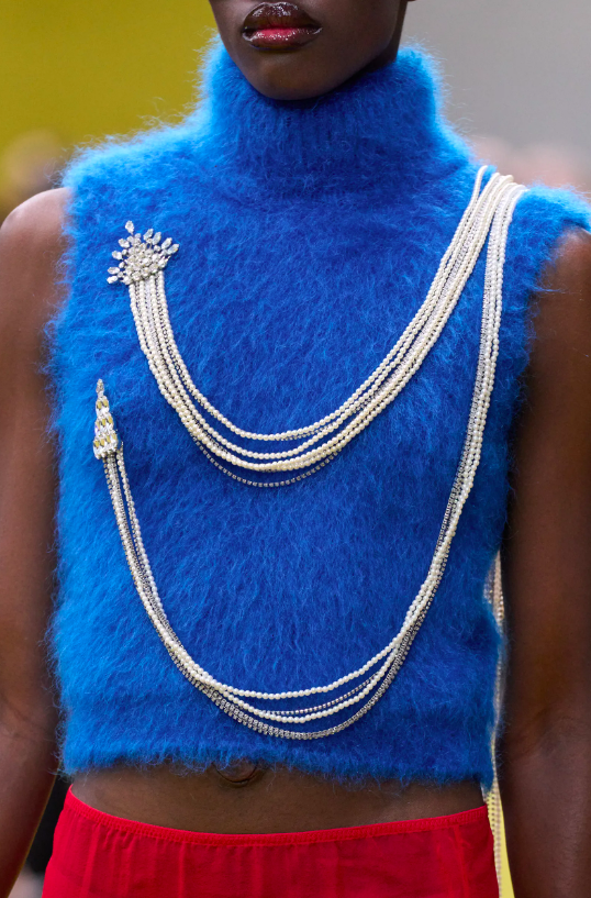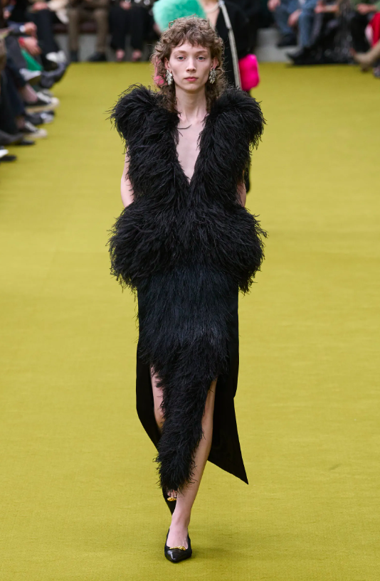 面料即觸感,好質感的服裝對奢侈品牌更為重要!拉絨馬海毛與毛圈紗線的針織衫、大量的人造皮草面料,帶來了溫度記憶;薄紗上衣、圍裹式半裙讓女性感迸發,帶來了神秘記憶;精緻工藝設計的晚禮服,從緊身胸衣連衣裙的低腰裙身,到繡有羽毛刺繡的連衣裙,再到Empire禮服的前胸線,帶來了文藝華美的品牌回憶…….