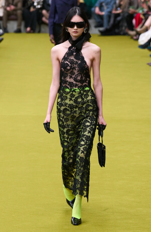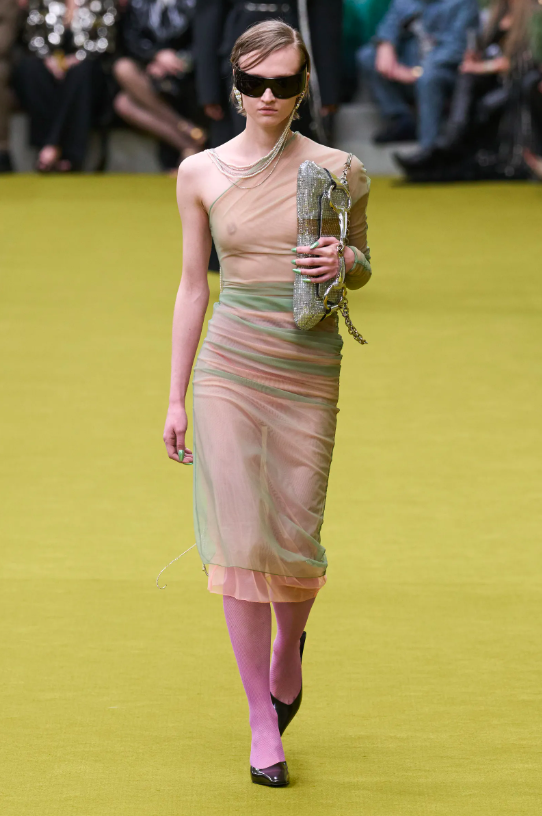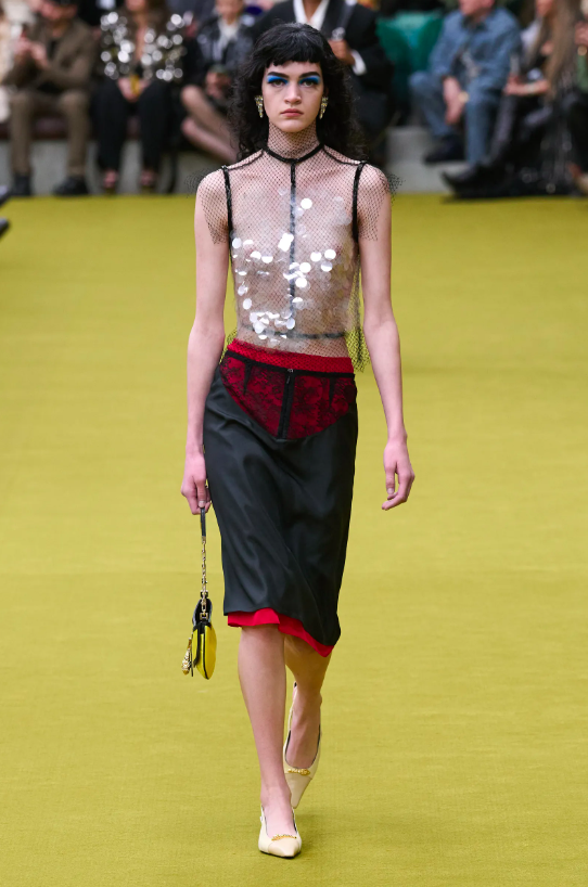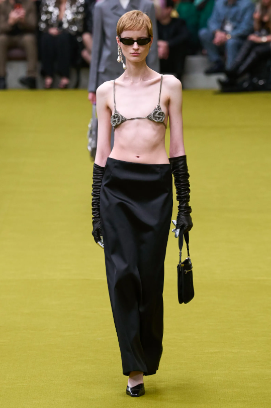 開場的第一套look造型極具視覺衝擊力,點綴著亮片、鑽飾的內衣搭配剪裁得當的長裙,性感迷人。同時模特大膽展示身材的姿態又給出了怪誕、叛逆、性感的基調,不免令人回想起1990年代至2000年代初期性感而迷人的古馳造型語言。