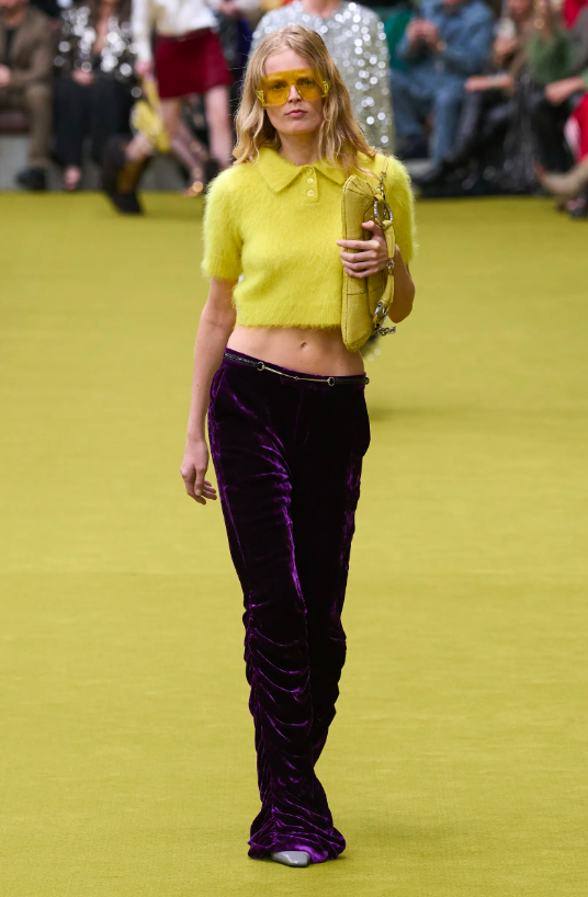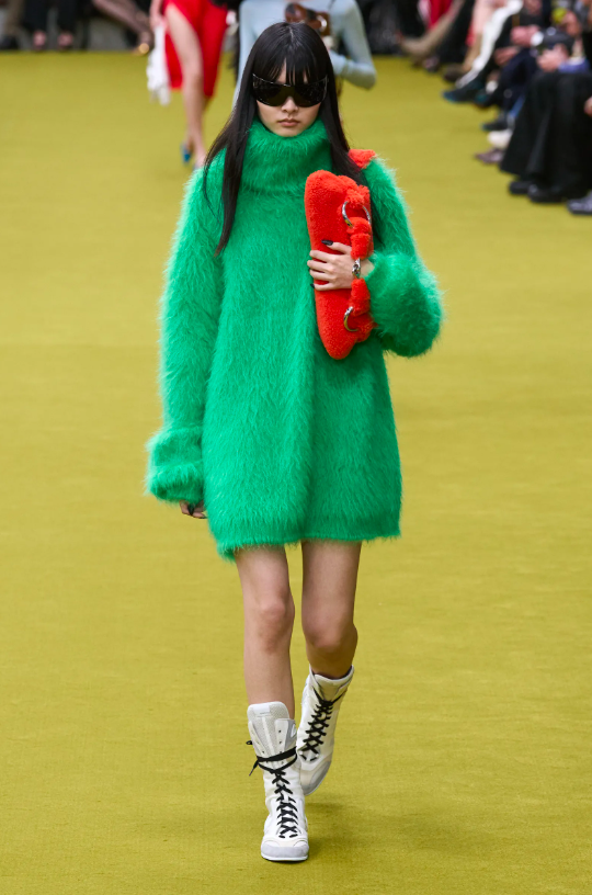 從眼睛裡投射出的感官記憶便是顏色!不論是 Tom Ford 時期還是Alessandro Michele 時期的GUCCI,時裝的色彩從不簡單。本季大秀上亮紫、桃紅、猩紅、電光藍等高飽和度色彩出現、碰撞,更帶來了濃濃的趣味性。