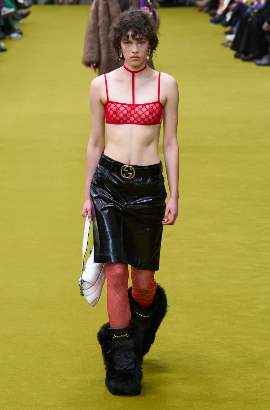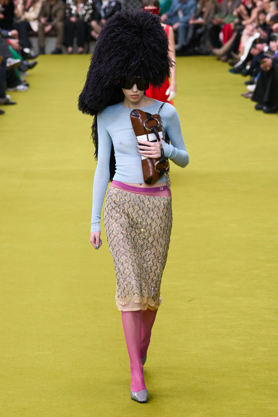 當然,精紡面料加長或齊膝設計的裙裝,蕾絲裝飾元素裝點的貼身內衣,鑲滿水晶的GG金屬內衣……這些單品被製成貼合身材的服飾穿插出現,配上華美、極具衝突性的華美色調又將人帶回2010年代的GUCCI式性感。