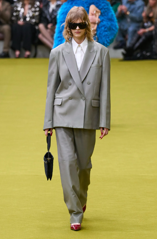 在原有的廓形上,品牌設計師們也加入了不少有趣的點子,特別是解構服裝這一點:羊毛或皮革西服以寬鬆版型、挺括肩角與低垂領口,並搭配低腰垂褶西褲來進行視覺切割,經典款正裝放大,同時使襯衫與兩件套的上裝與裙子縮小。
