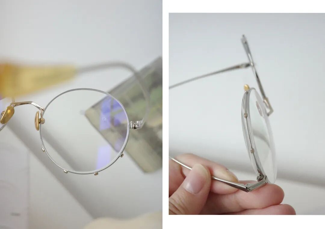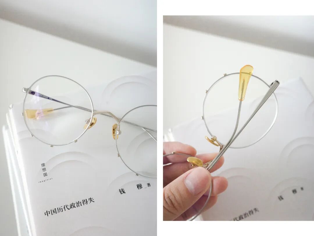 當時店裡有黃和白,我選了更特別的黃色。(還考慮到白色樹脂戴久了也容易變黃)鏡框是淡淡的金色,比較襯黃皮。
