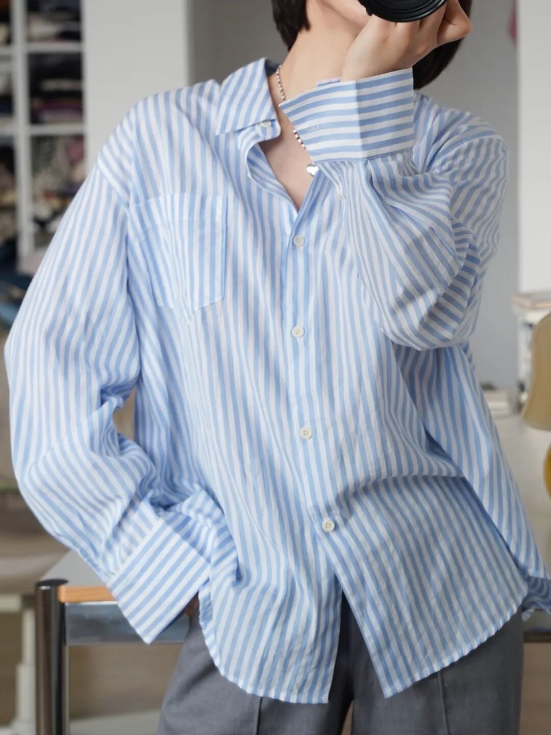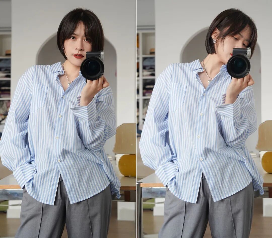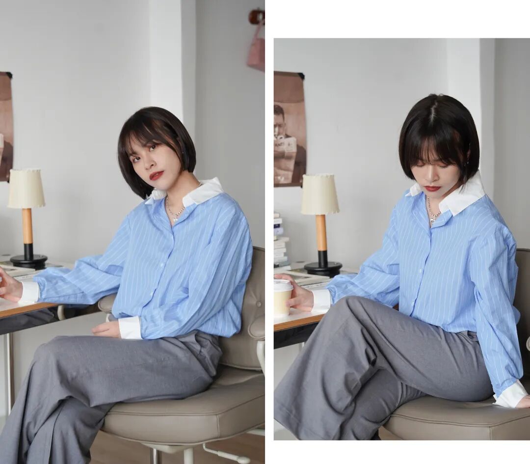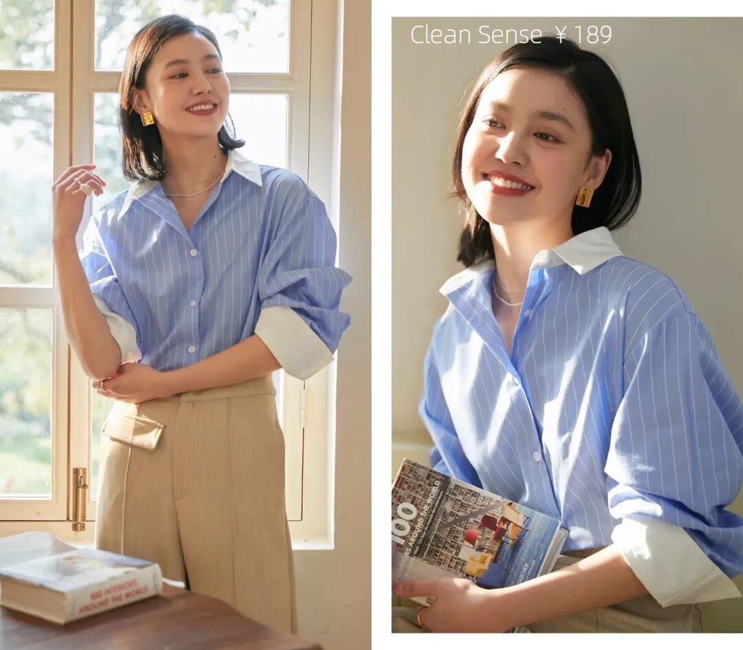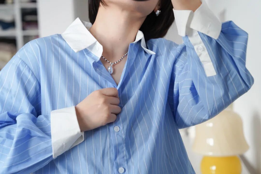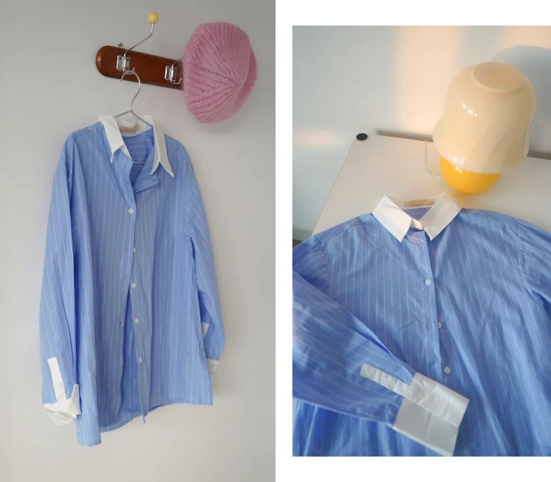 開春感覺我直接跳過了外套、針織,開始買襯衫了。首先是清爽的藍色條紋襯衫,我給大家搭配了一下灰色外套和粉色配飾~