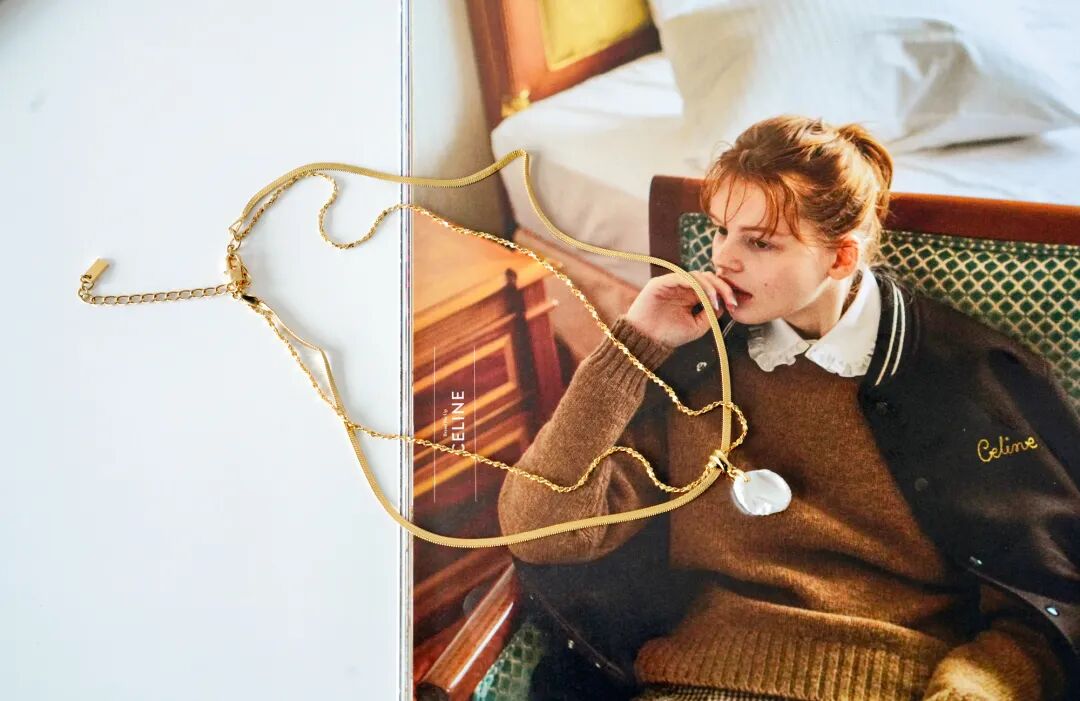 這條鎖骨鏈很法式!超美的!在普通的金屬項鍊上加了麻花鏈,更加特別~雙層設計,戴在鎖骨上很有層次感。