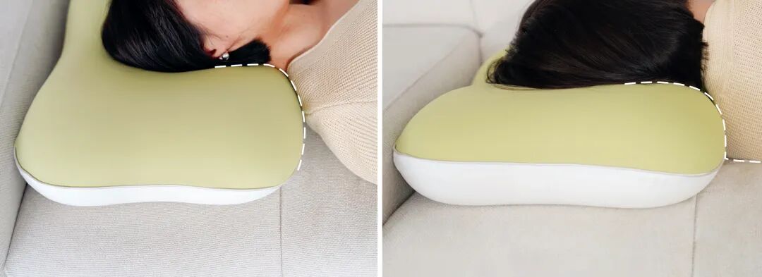 中間是凹進去的設計,不管正睡/側睡,都能完美貼合肩頸,能維持頸椎良好的生理曲度。驚喜的是,側睡完全不壓耳朵~