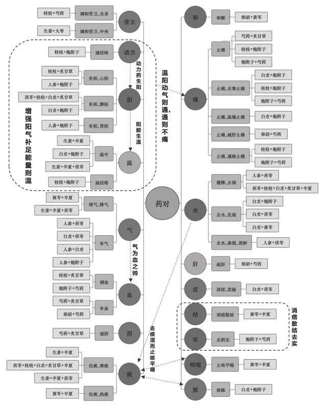 根據問止中醫學習大腦“重要結構符合方劑”的分析,我們可以看得出來這個方劑主要是由柴胡桂枝湯和真武湯的結構組成。
