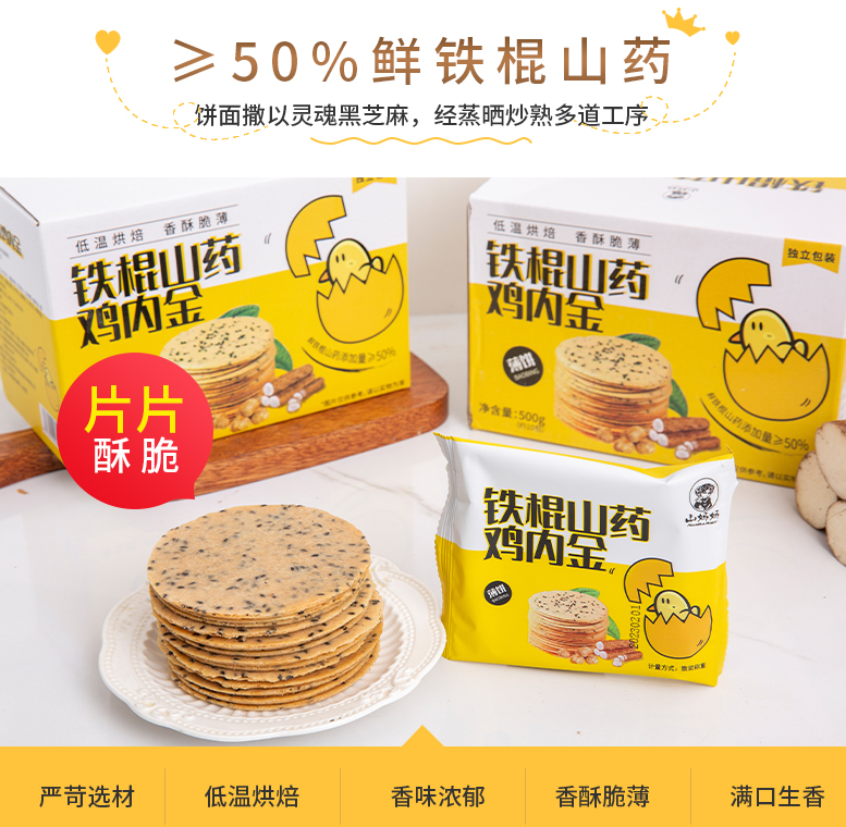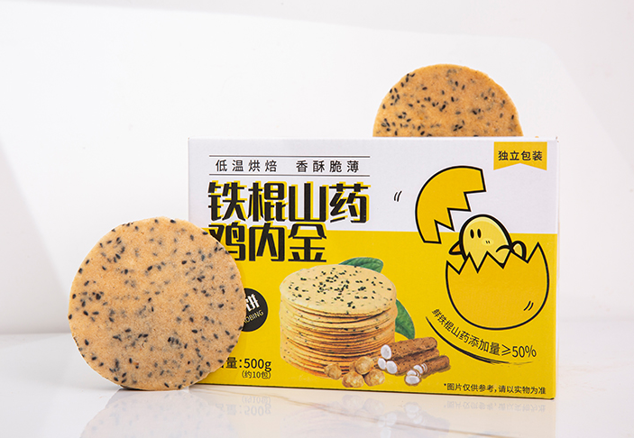 這款山藥雞內金薄餅以山藥、黑芝麻、雞內金、猴頭菇、核桃仁作為基本原料搭配結合,經幾百次搭配試驗,最終調試出最佳的原料比例配比。