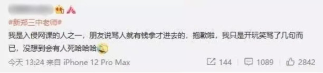 “我是入侵網課的人之一,朋友說罵人就有錢拿才進去的,抱歉啦,我只是開玩笑罵了幾句而已,沒想到會有人死哈哈。”