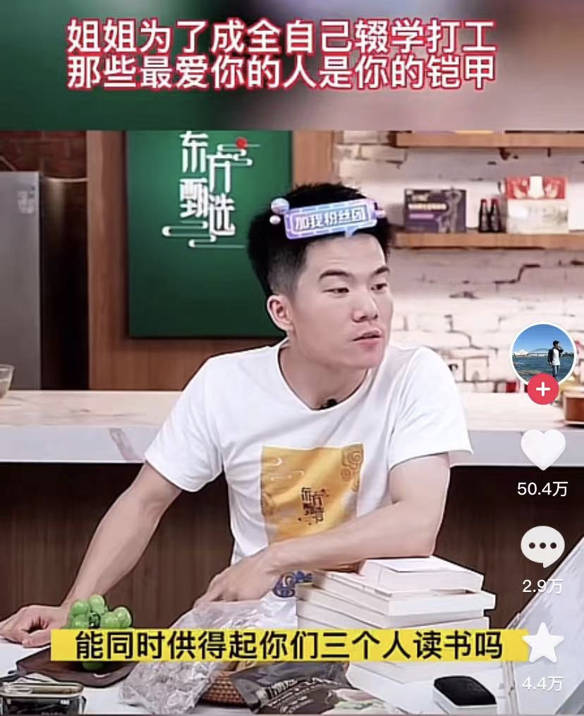 直到後來,媽媽才告訴董宇輝,“你以為姐姐是真的不想讀書嗎?你覺得我們家能同時供得起三個人讀書嗎?”