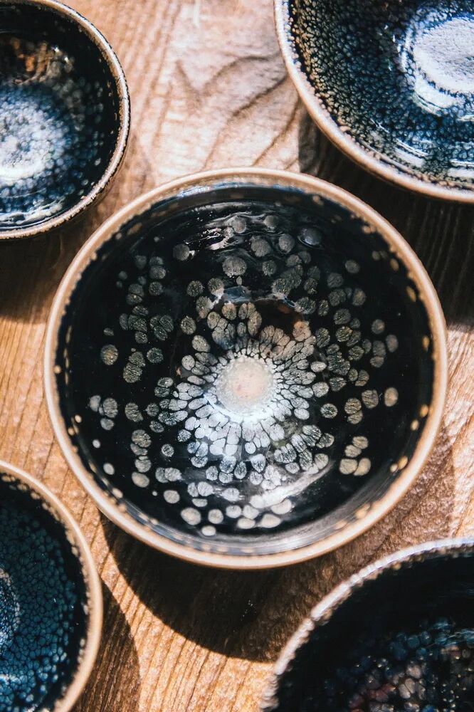 真正的建盞,必須採用建陽坯土、建陽原礦釉燒製,是鐵系高溫自然結晶體,斑紋一次自然形成,沒有任何人工合成色釉,不是色釉彩繪,也不是二次上釉二次燒製,完全“看天吃飯”,成品率低,十分珍貴。所以,在許多人看來,用真正建盞喝茶,是身份與個性的象徵。