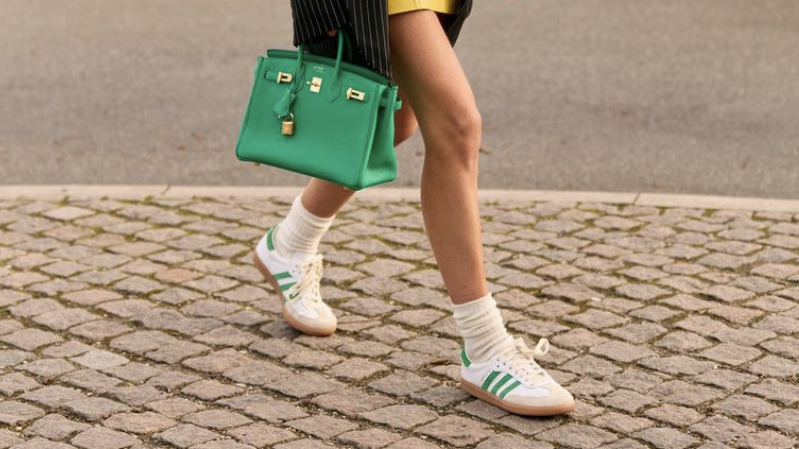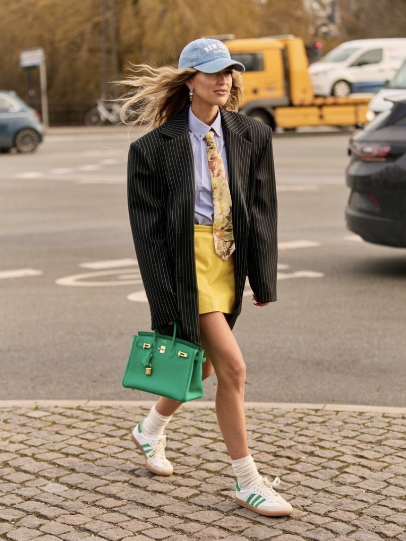 覺得這樣太過校園風,已經是兩個孩子媽的博主Stella Von Senger混搭了潮流單品。她的格子西裝外套,搭配了皮褲,用野生感很強的皮革單品,讓校園制服看起來不那麼乖,又符合年齡。Emili Sindlev最近在哥本哈根時裝週這套也超級哇塞!她本來就是不折不扣的彩色控,藍、綠、黃、黑、白這麼多顏色同時出現在她身上都被消化得很好。雖然甜蜜的彩色含量很高,但她用平日最喜歡的墊肩西裝、棒球帽、運動鞋、領帶讓彩色酷中帶甜。