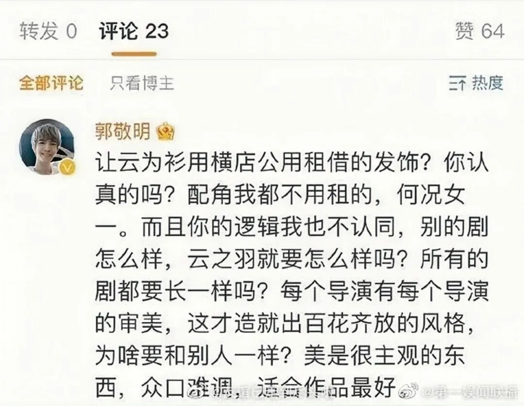 虞書欣的頭飾被嘲不如橫店公用的,郭敬明下場回應:
