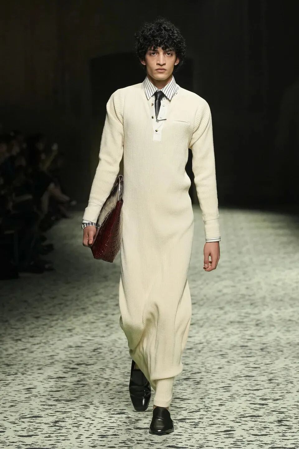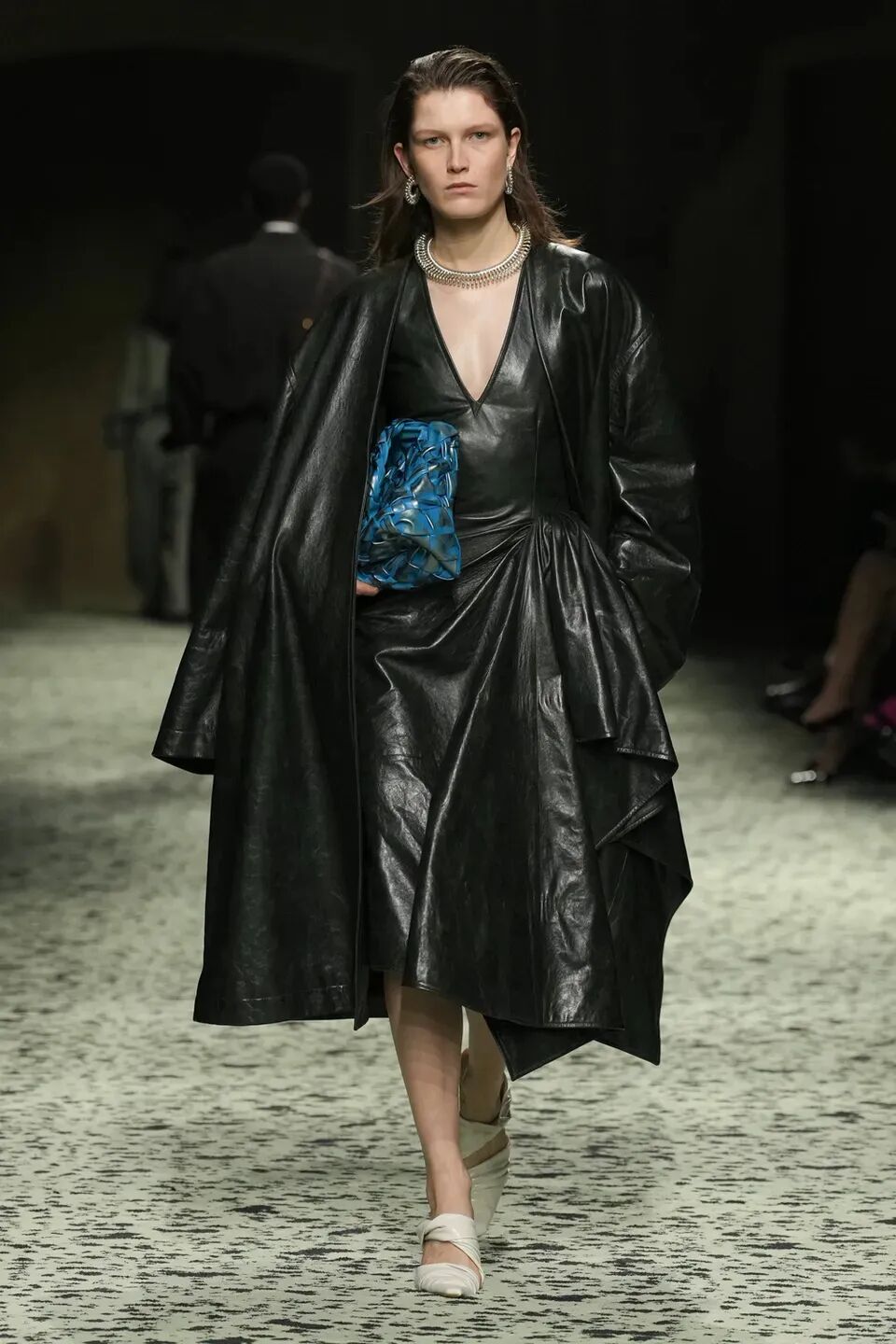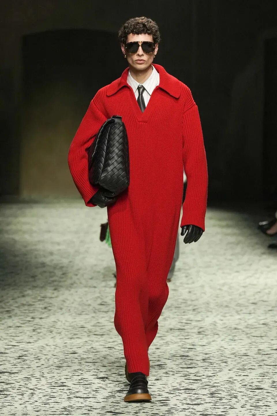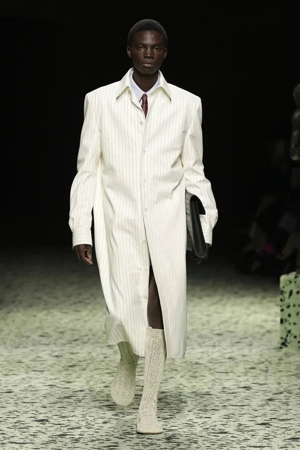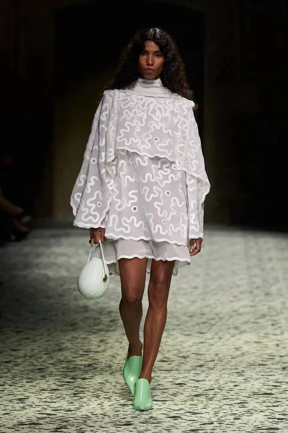 本季是Matthieu Blazy打造的“意大利”三部曲最終章,從奇異嘉年華中汲取靈感,街道上穿著睡衣的夢遊者繼續彰顯著BOTTEGA VENETA強大的制皮工藝。開場的白色睡裙看似清爽的,實際上是由納帕皮革製成,就連襪子也是用針織打造的“皮鞋”。