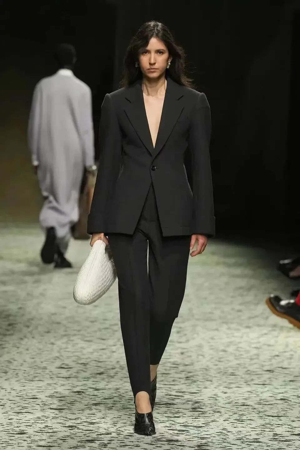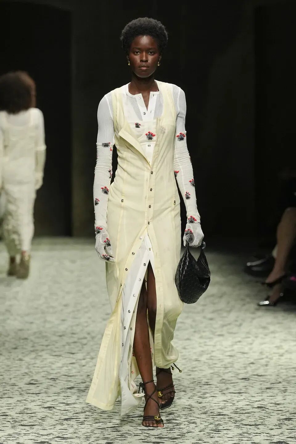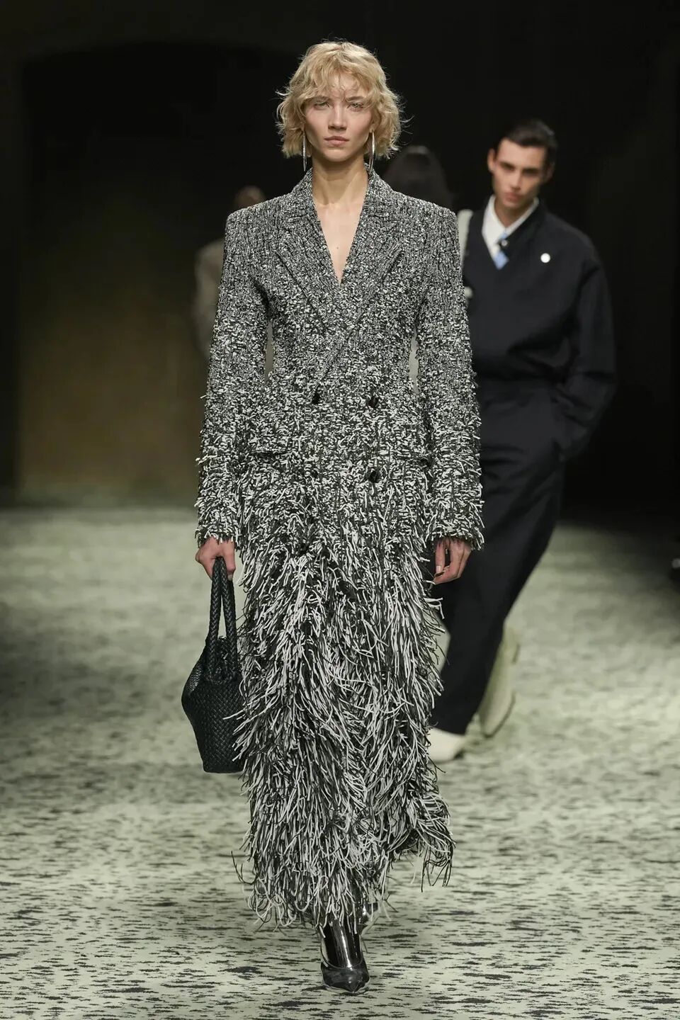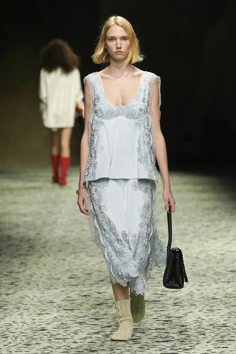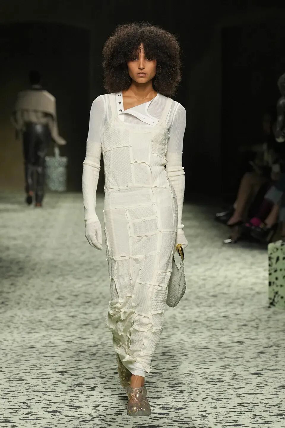 本季是Matthieu Blazy打造的“意大利”三部曲最終章,從奇異嘉年華中汲取靈感,街道上穿著睡衣的夢遊者繼續彰顯著BOTTEGA VENETA強大的制皮工藝。開場的白色睡裙看似清爽的,實際上是由納帕皮革製成,就連襪子也是用針織打造的“皮鞋”。