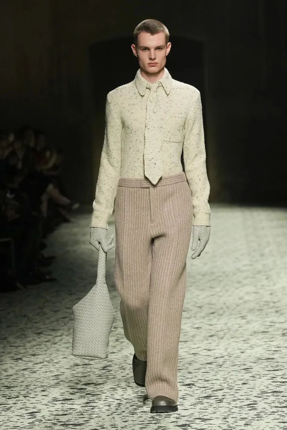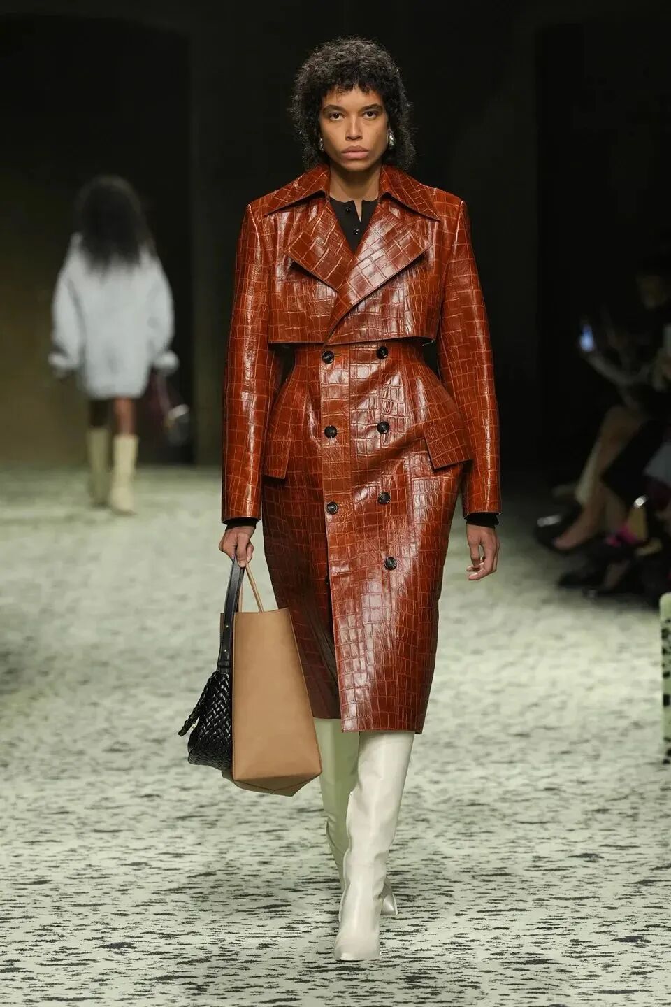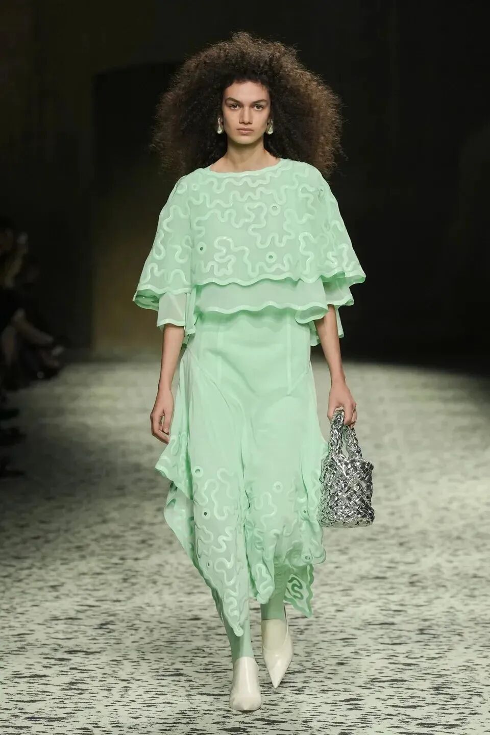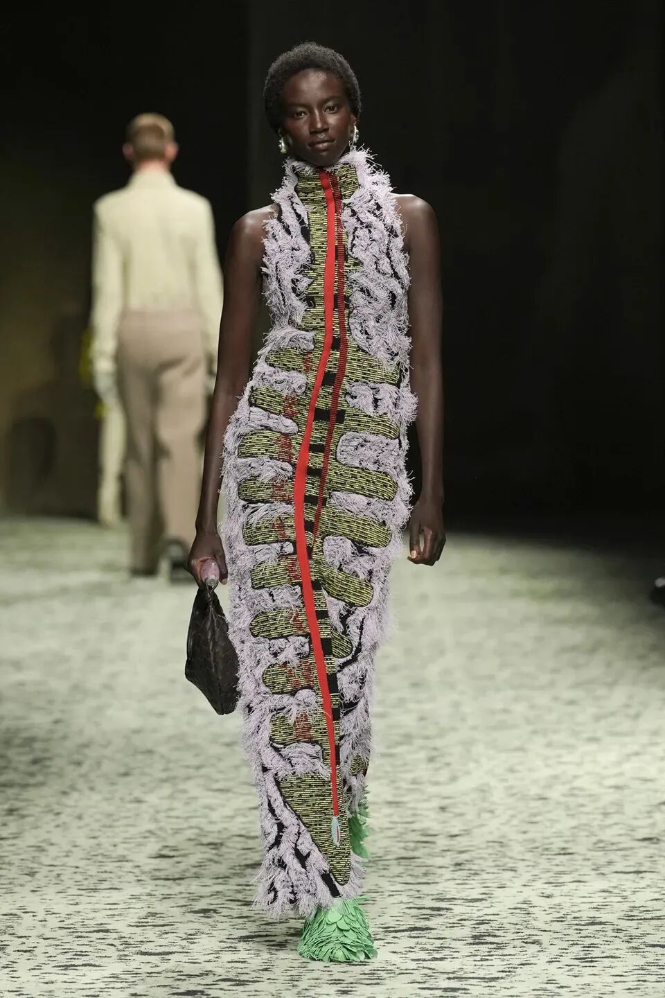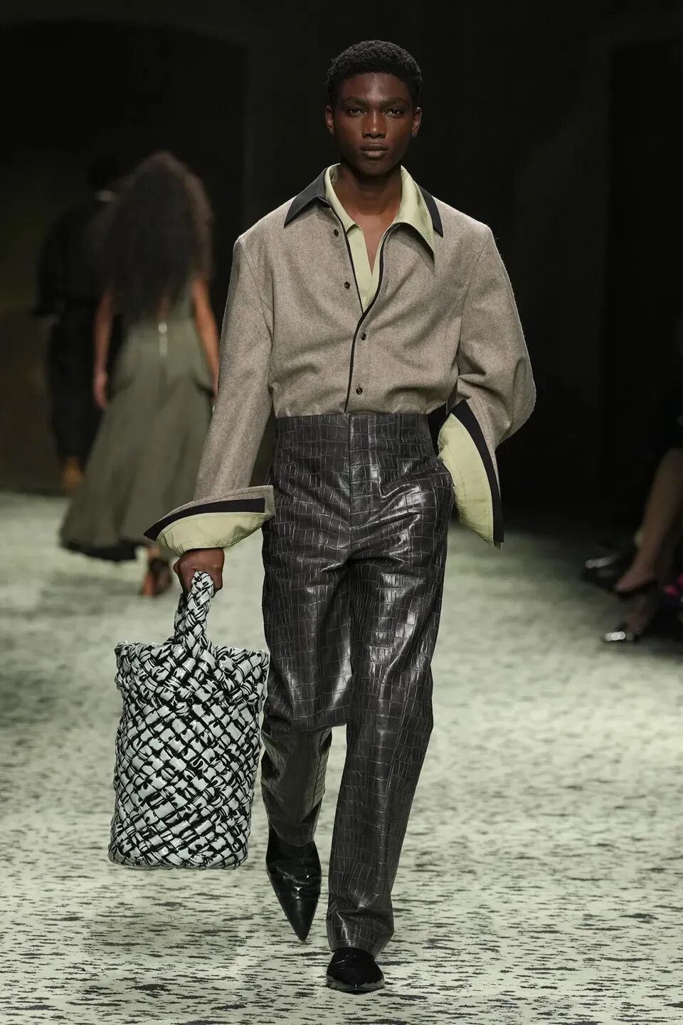 本季是Matthieu Blazy打造的“意大利”三部曲最終章,從奇異嘉年華中汲取靈感,街道上穿著睡衣的夢遊者繼續彰顯著BOTTEGA VENETA強大的制皮工藝。開場的白色睡裙看似清爽的,實際上是由納帕皮革製成,就連襪子也是用針織打造的“皮鞋”。