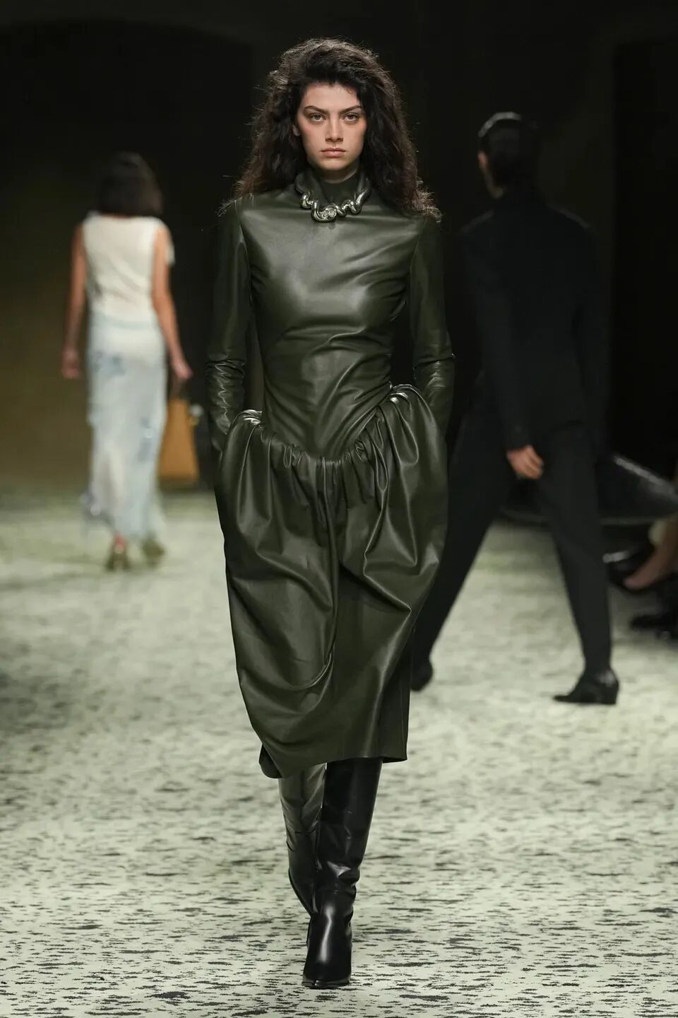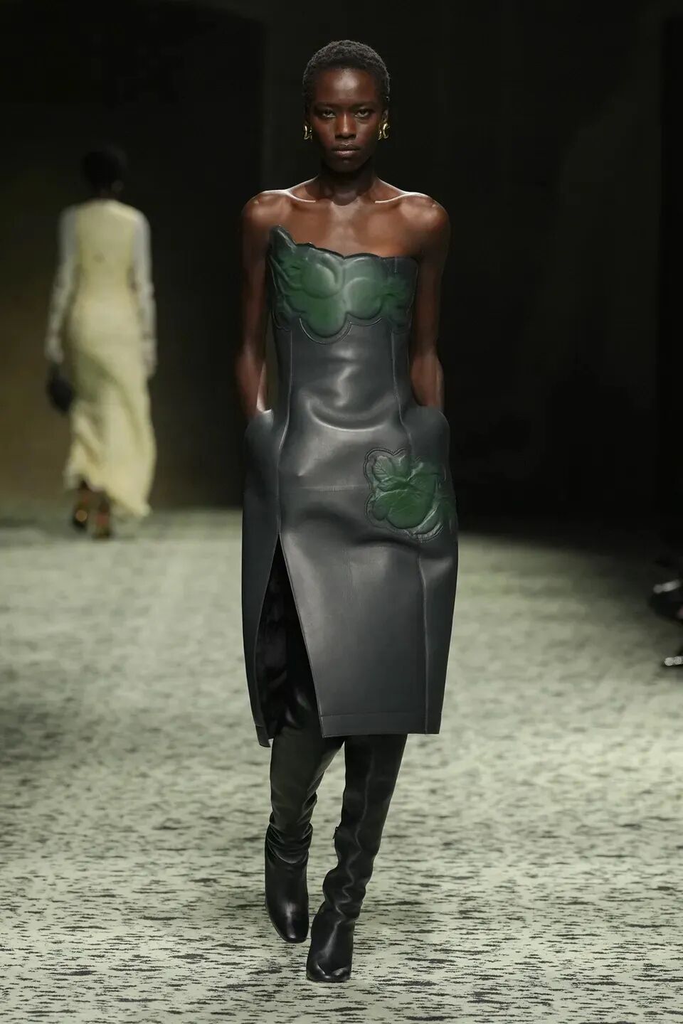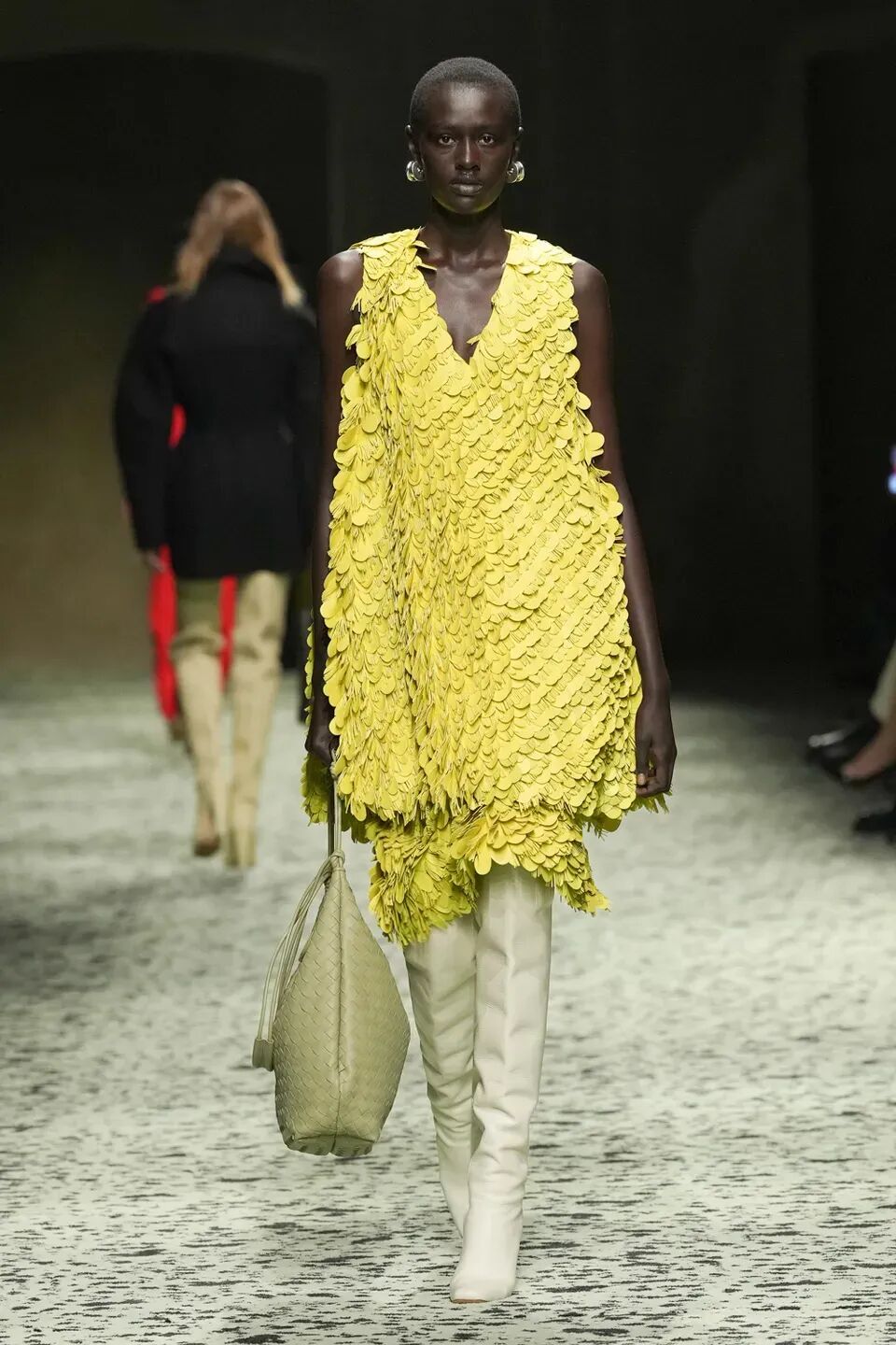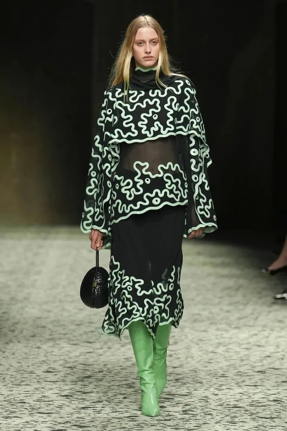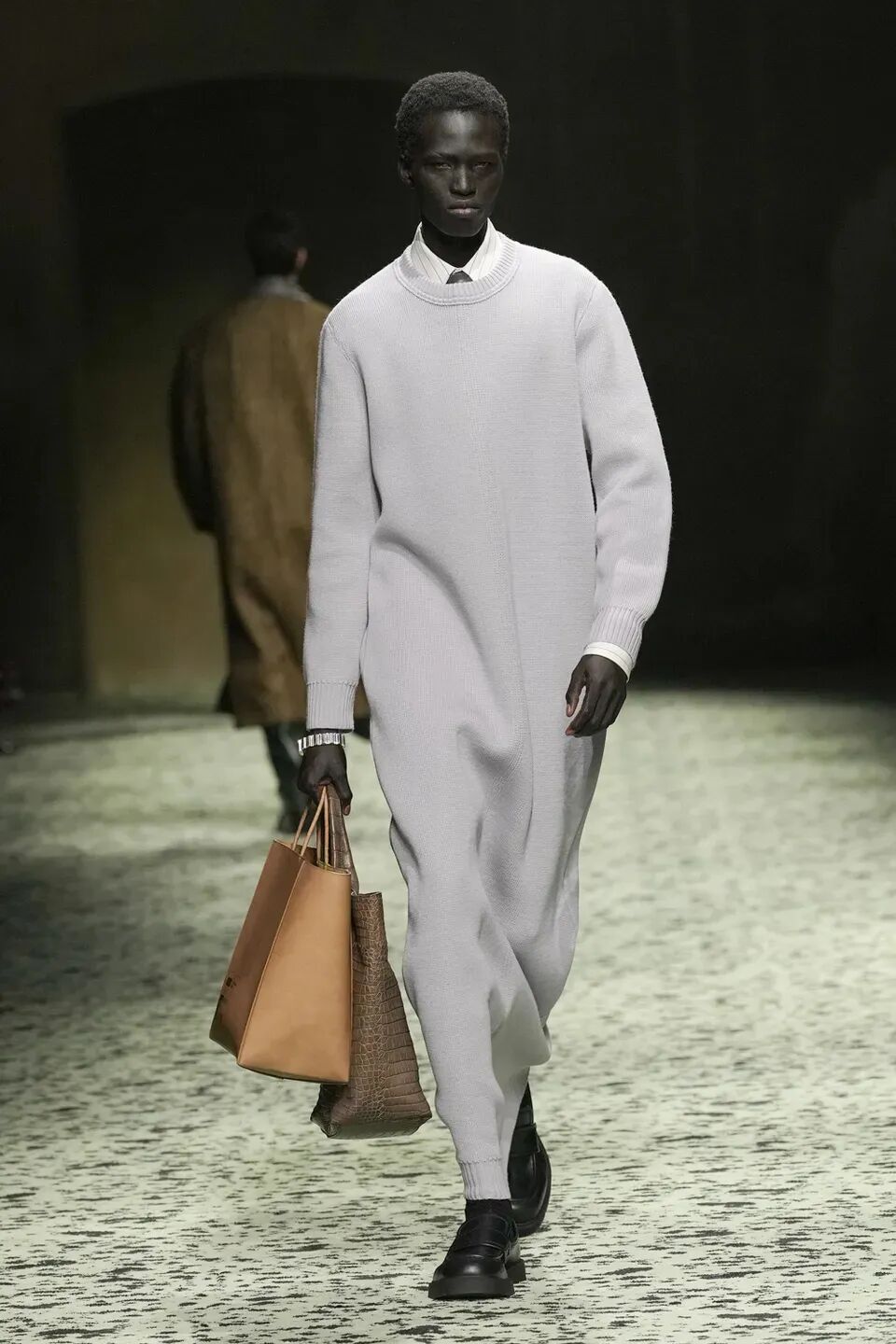 本季是Matthieu Blazy打造的“意大利”三部曲最終章,從奇異嘉年華中汲取靈感,街道上穿著睡衣的夢遊者繼續彰顯著BOTTEGA VENETA強大的制皮工藝。開場的白色睡裙看似清爽的,實際上是由納帕皮革製成,就連襪子也是用針織打造的“皮鞋”。