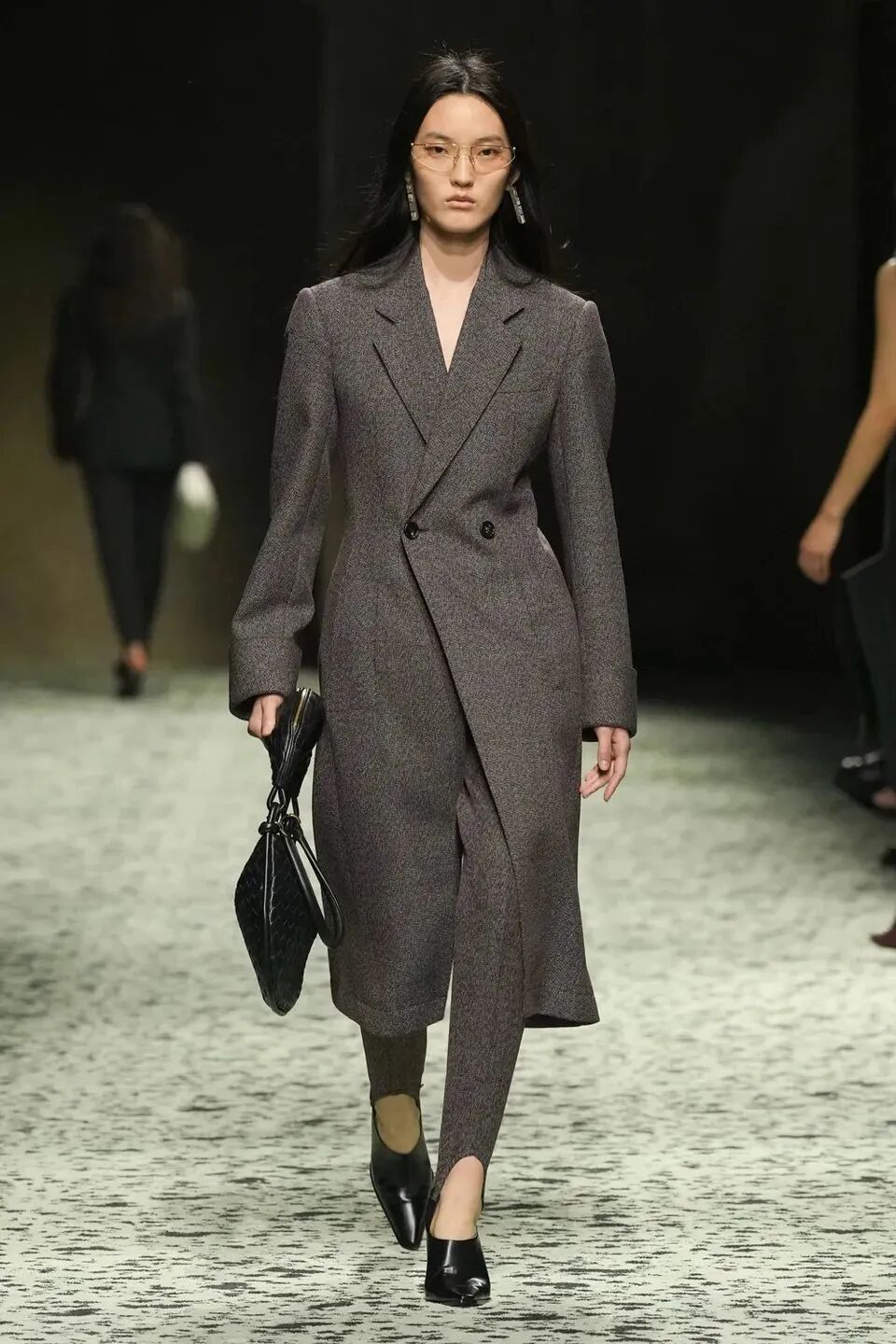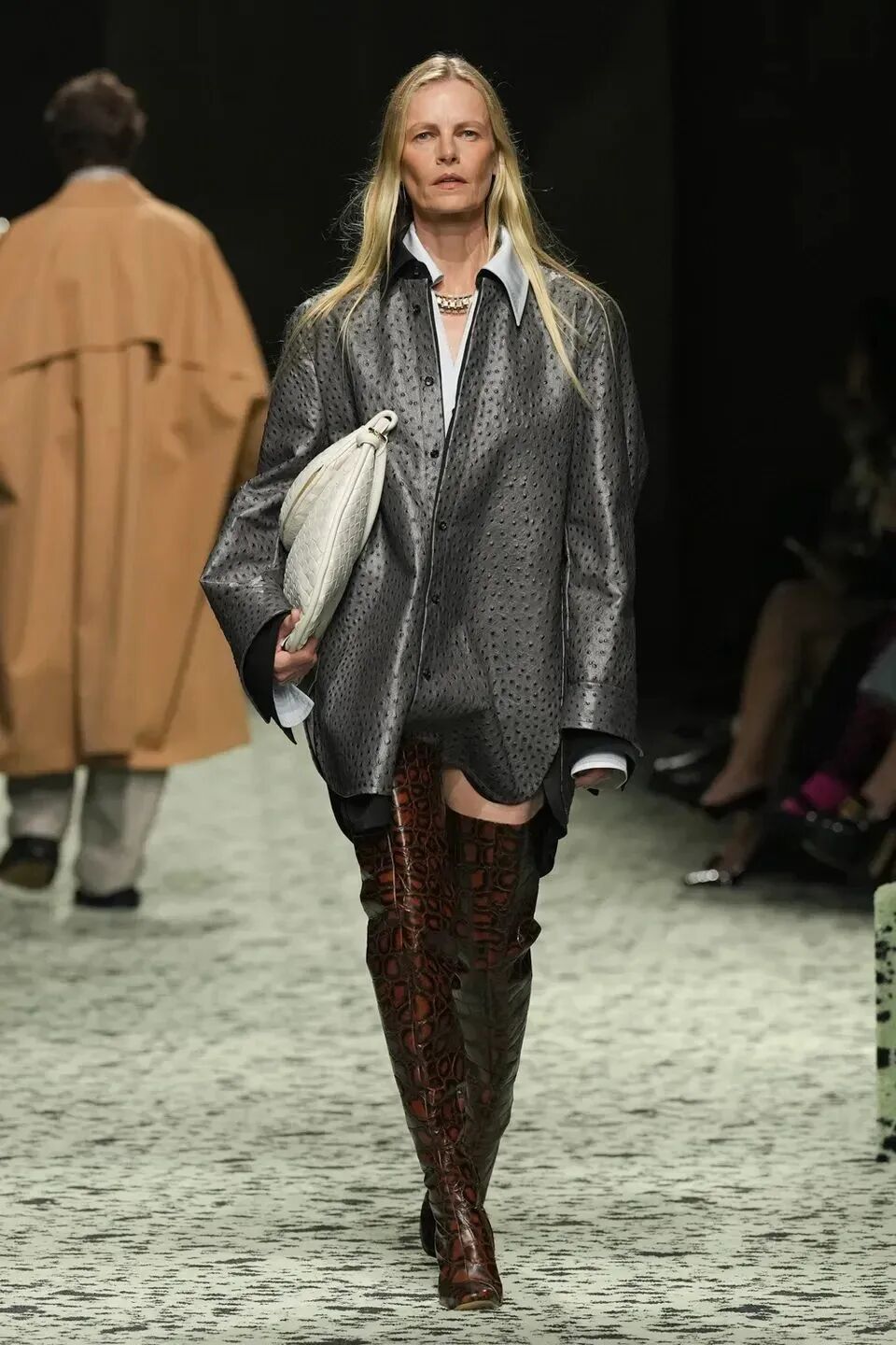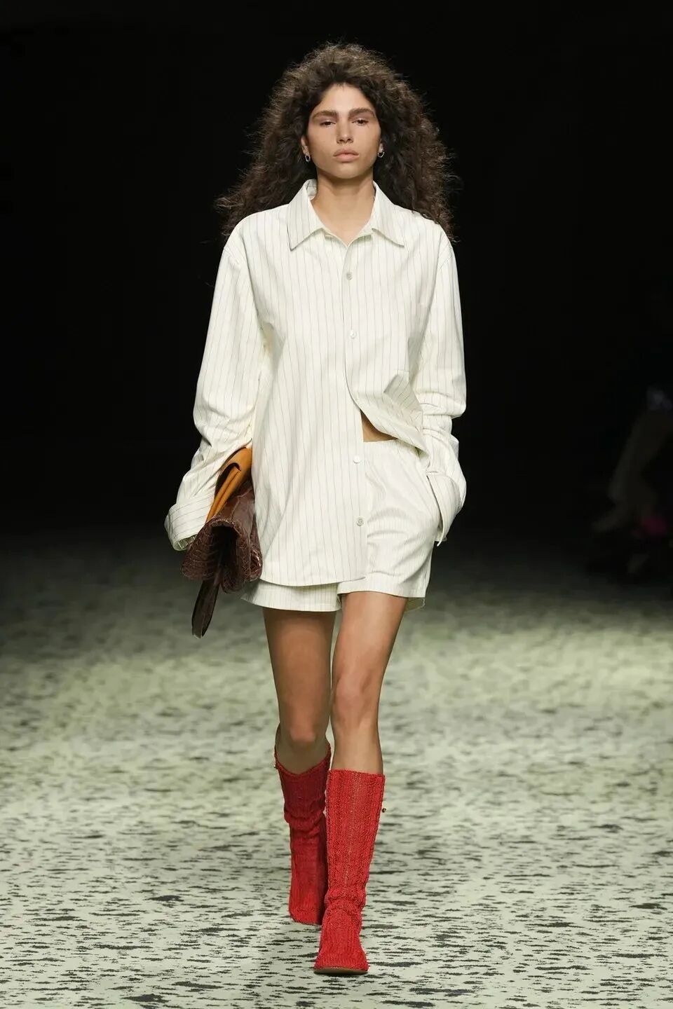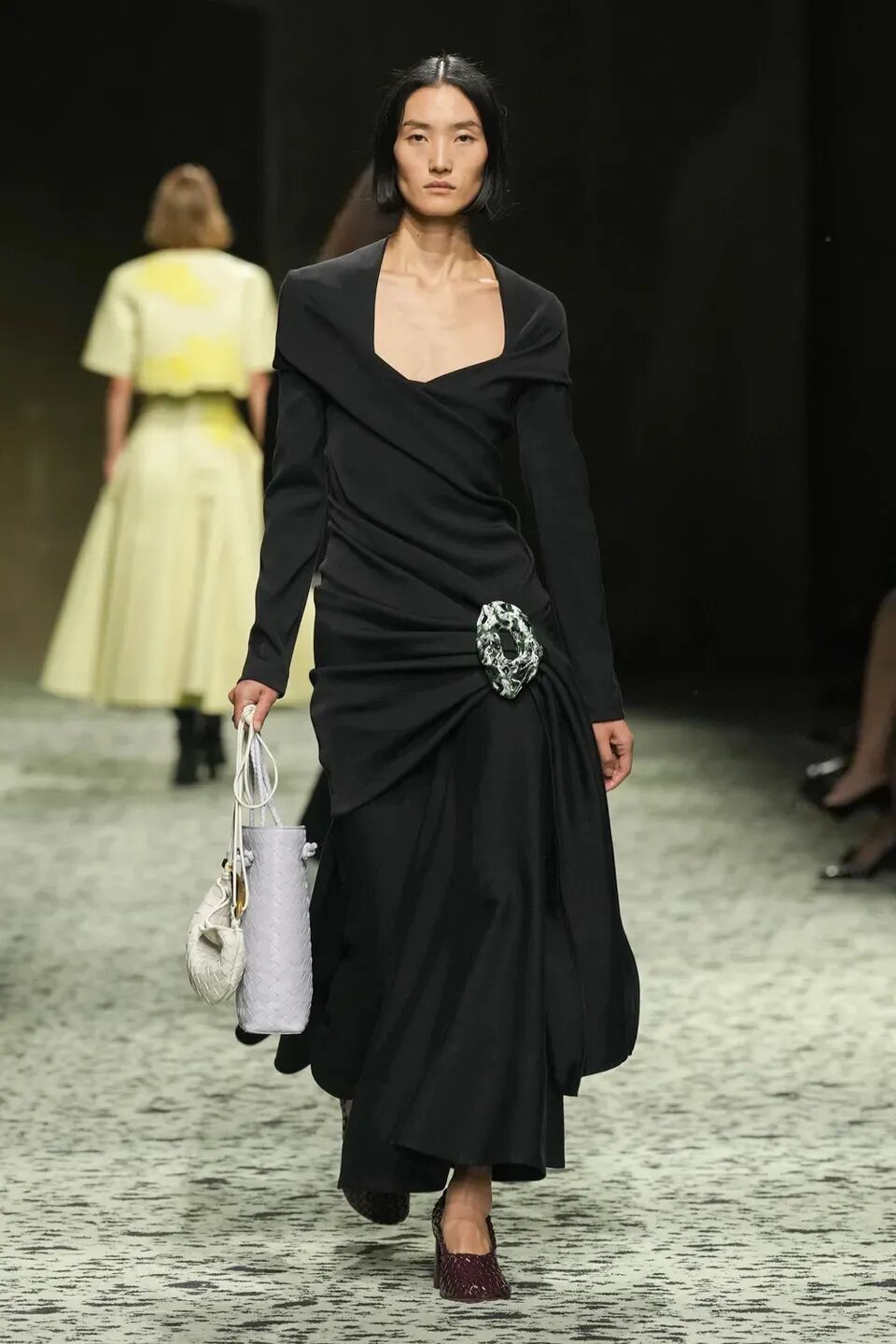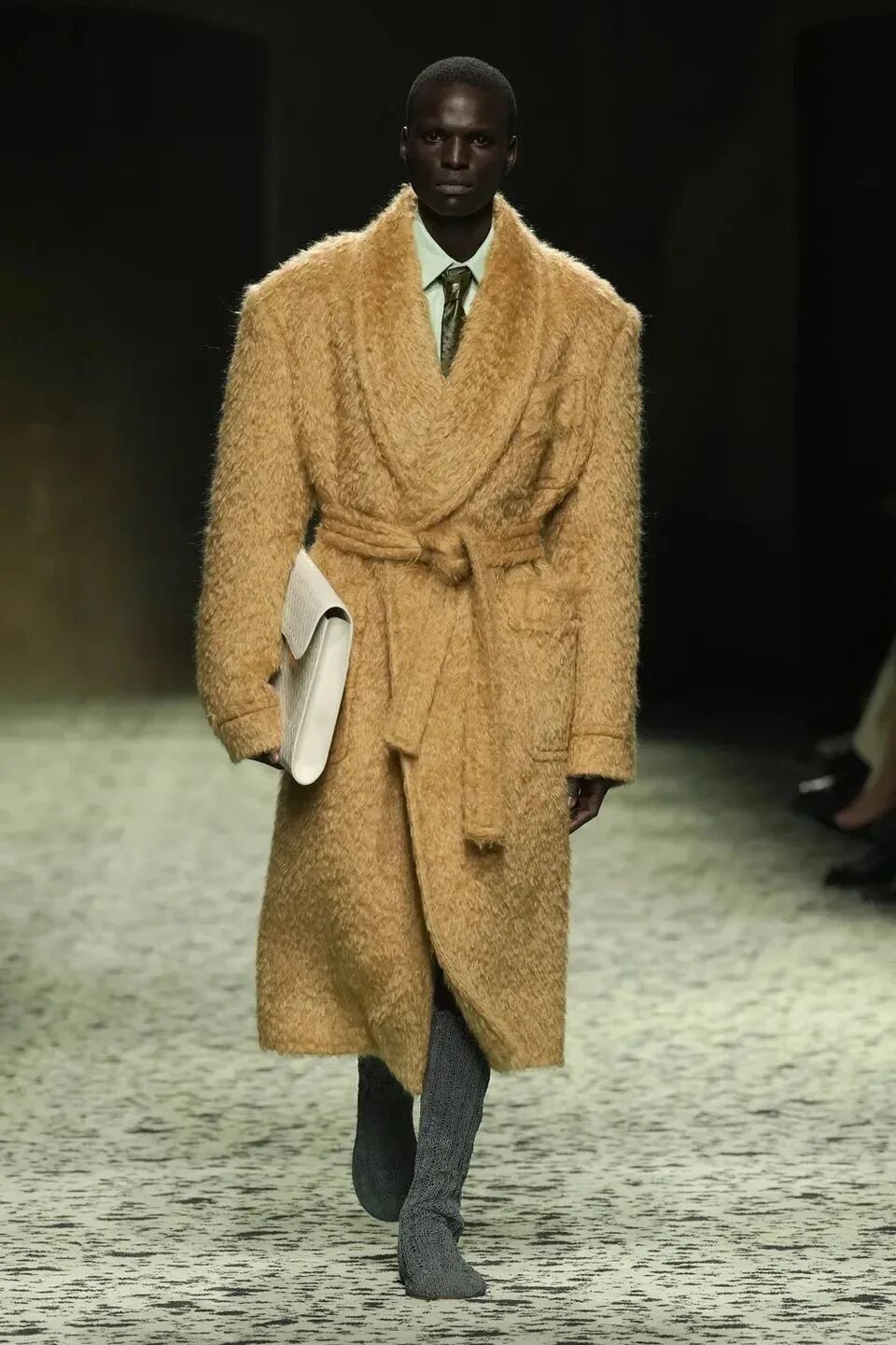 本季是Matthieu Blazy打造的“意大利”三部曲最終章,從奇異嘉年華中汲取靈感,街道上穿著睡衣的夢遊者繼續彰顯著BOTTEGA VENETA強大的制皮工藝。開場的白色睡裙看似清爽的,實際上是由納帕皮革製成,就連襪子也是用針織打造的“皮鞋”。