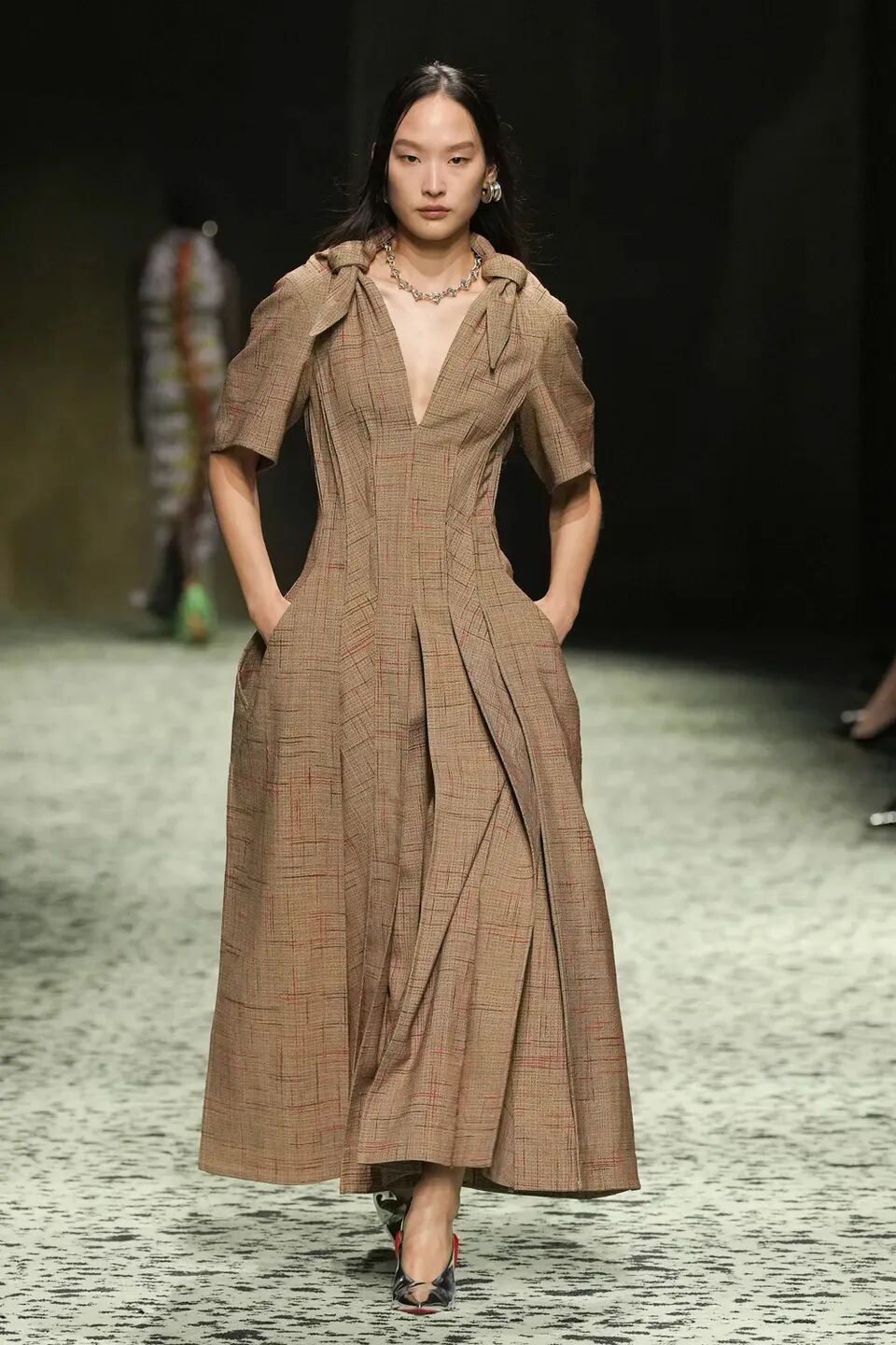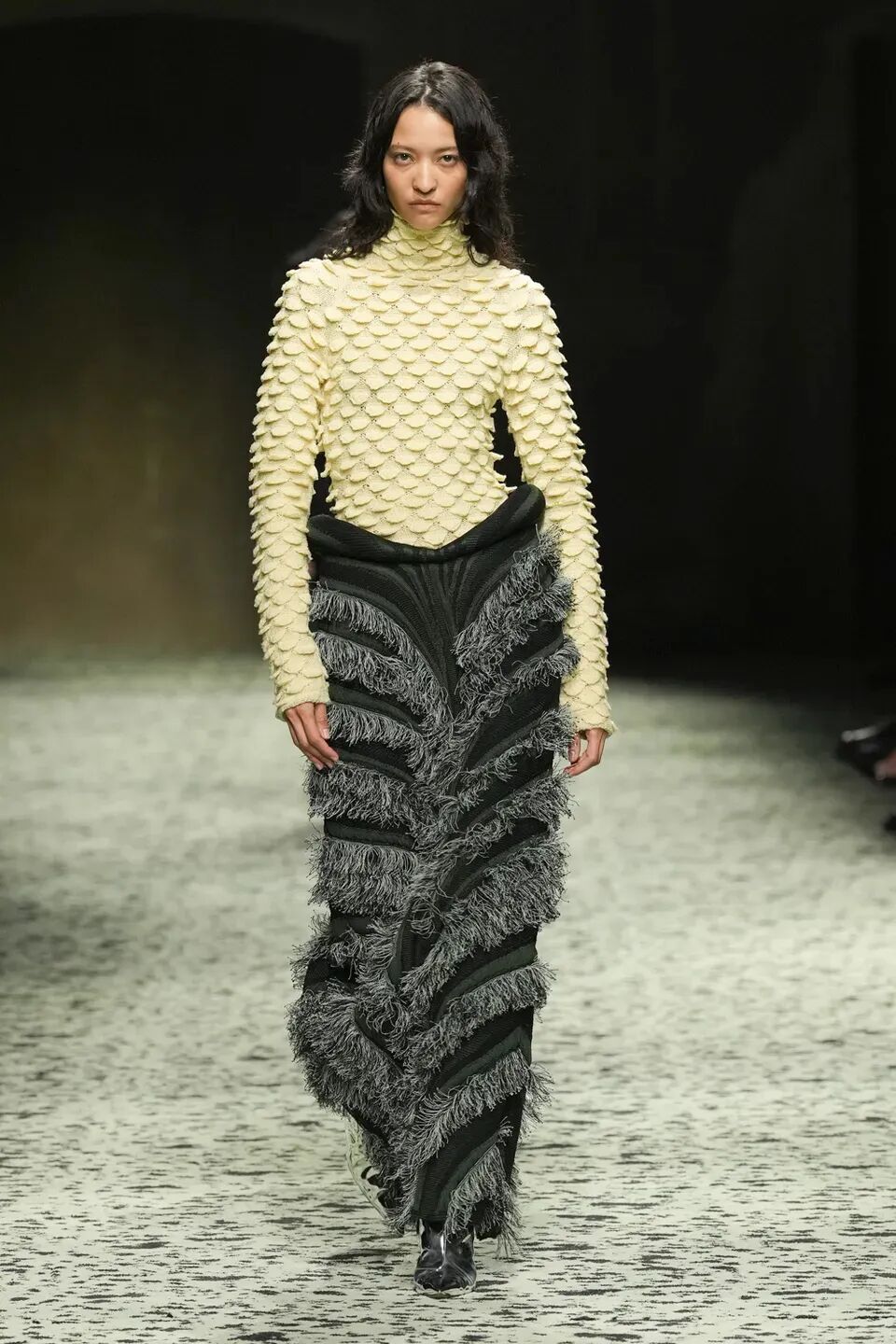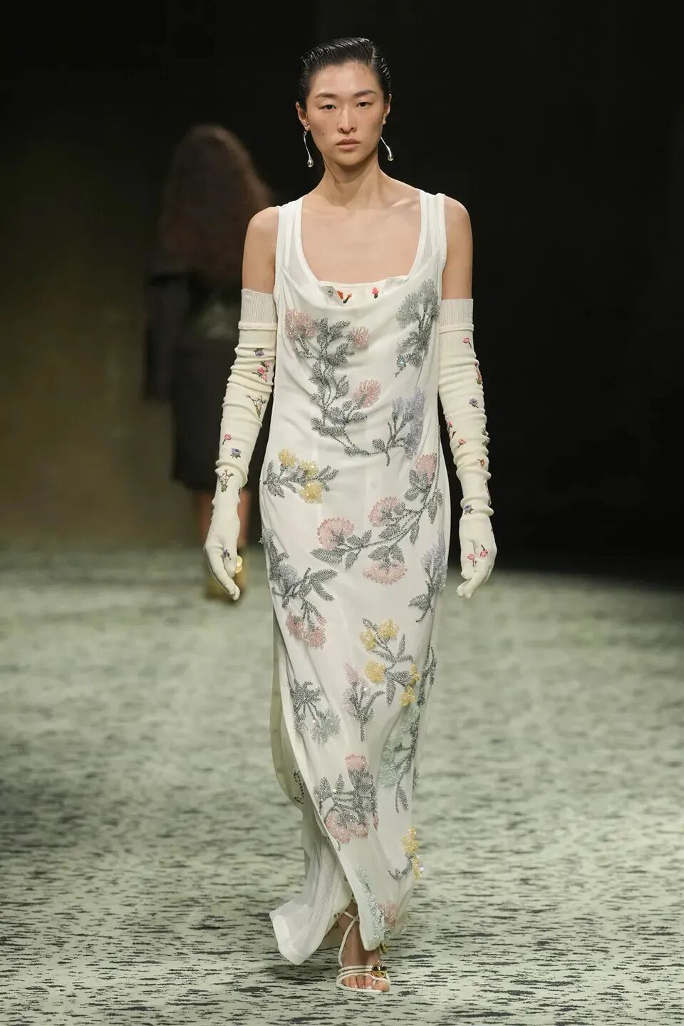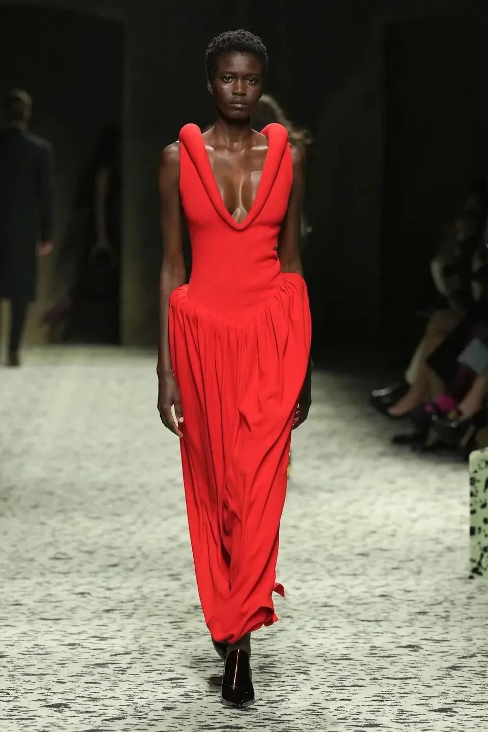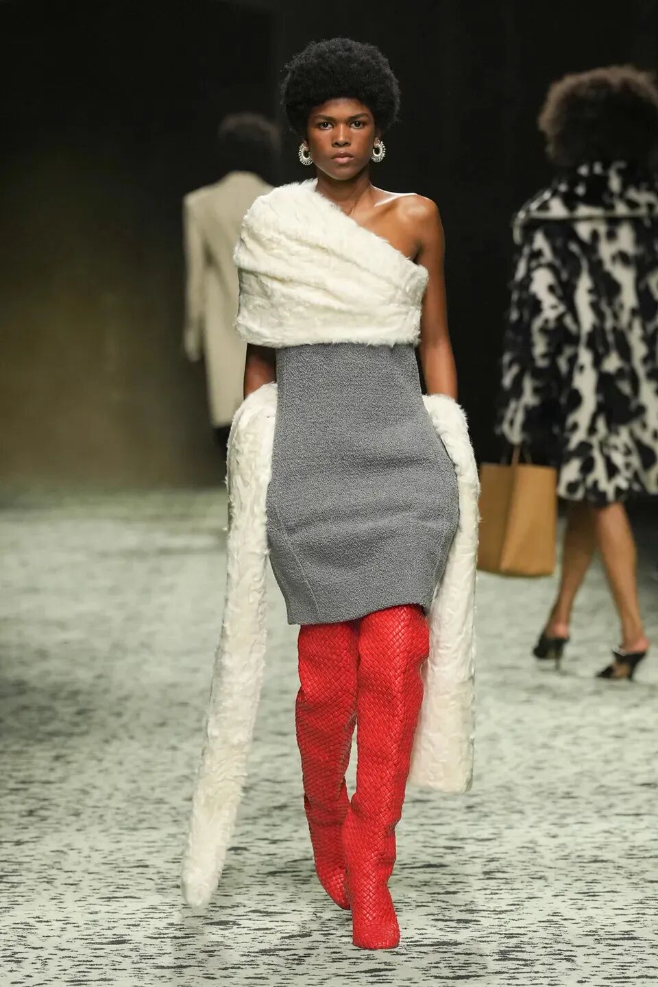 本季是Matthieu Blazy打造的“意大利”三部曲最終章,從奇異嘉年華中汲取靈感,街道上穿著睡衣的夢遊者繼續彰顯著BOTTEGA VENETA強大的制皮工藝。開場的白色睡裙看似清爽的,實際上是由納帕皮革製成,就連襪子也是用針織打造的“皮鞋”。