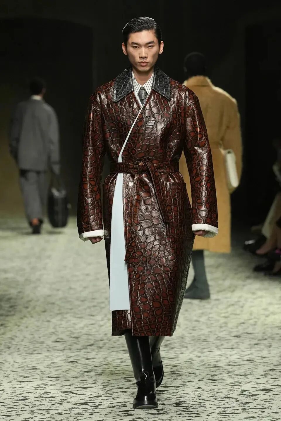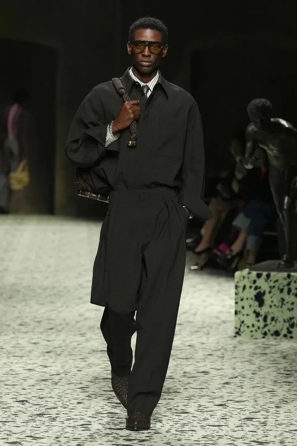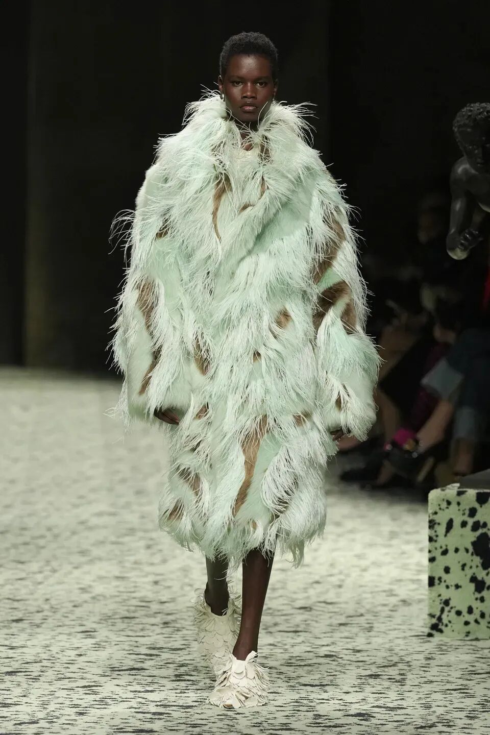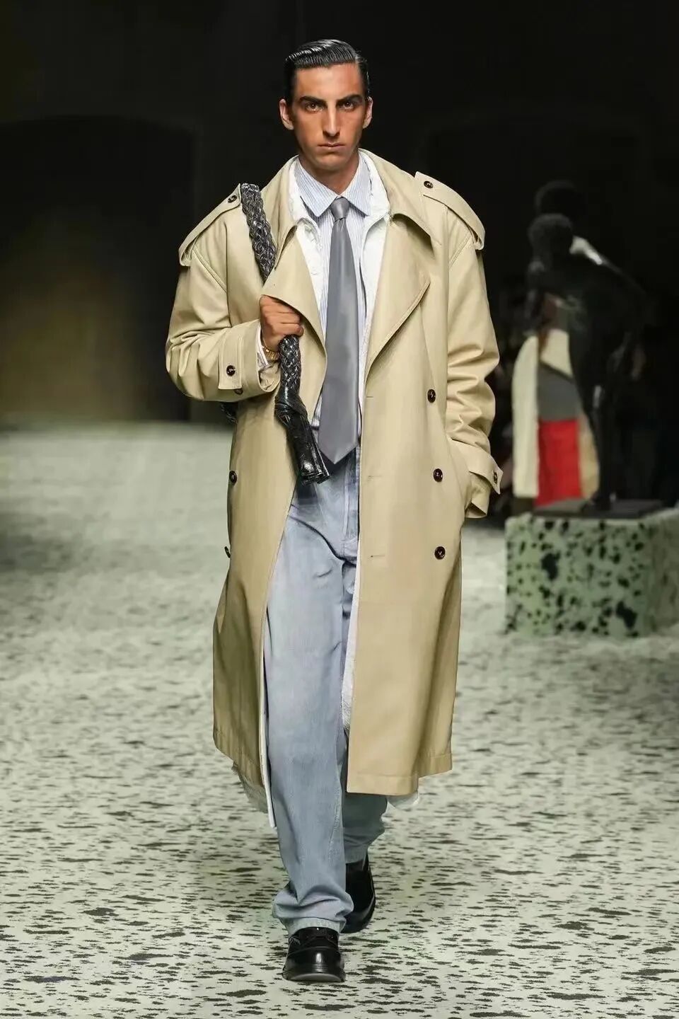 舒服的淡綠色地毯在秀場排開,裡面裝飾著古羅馬的青銅跑者,無不向精細考究的意大利手工藝致敬。