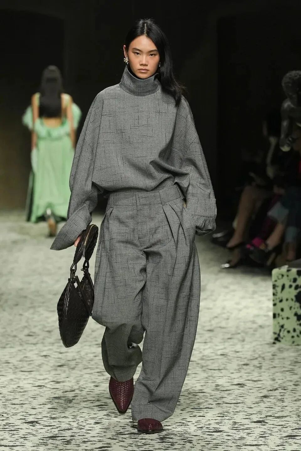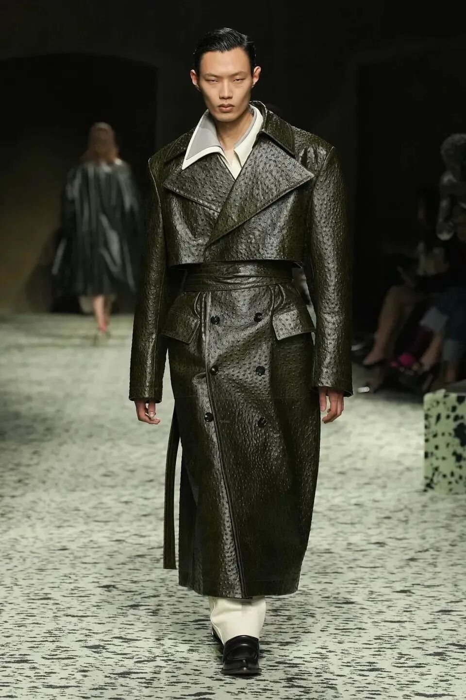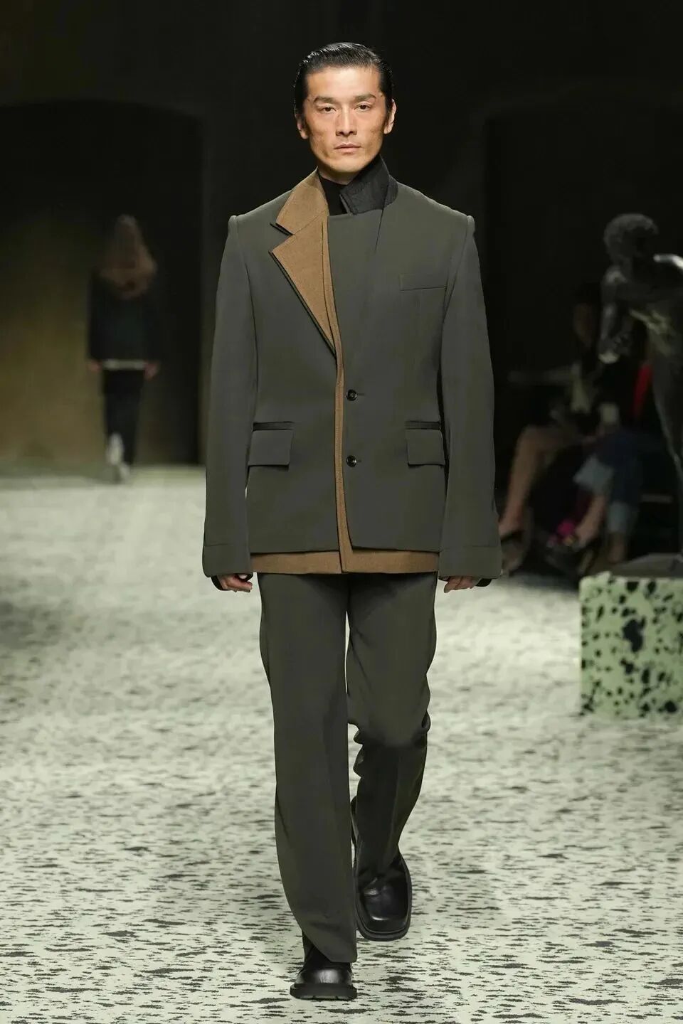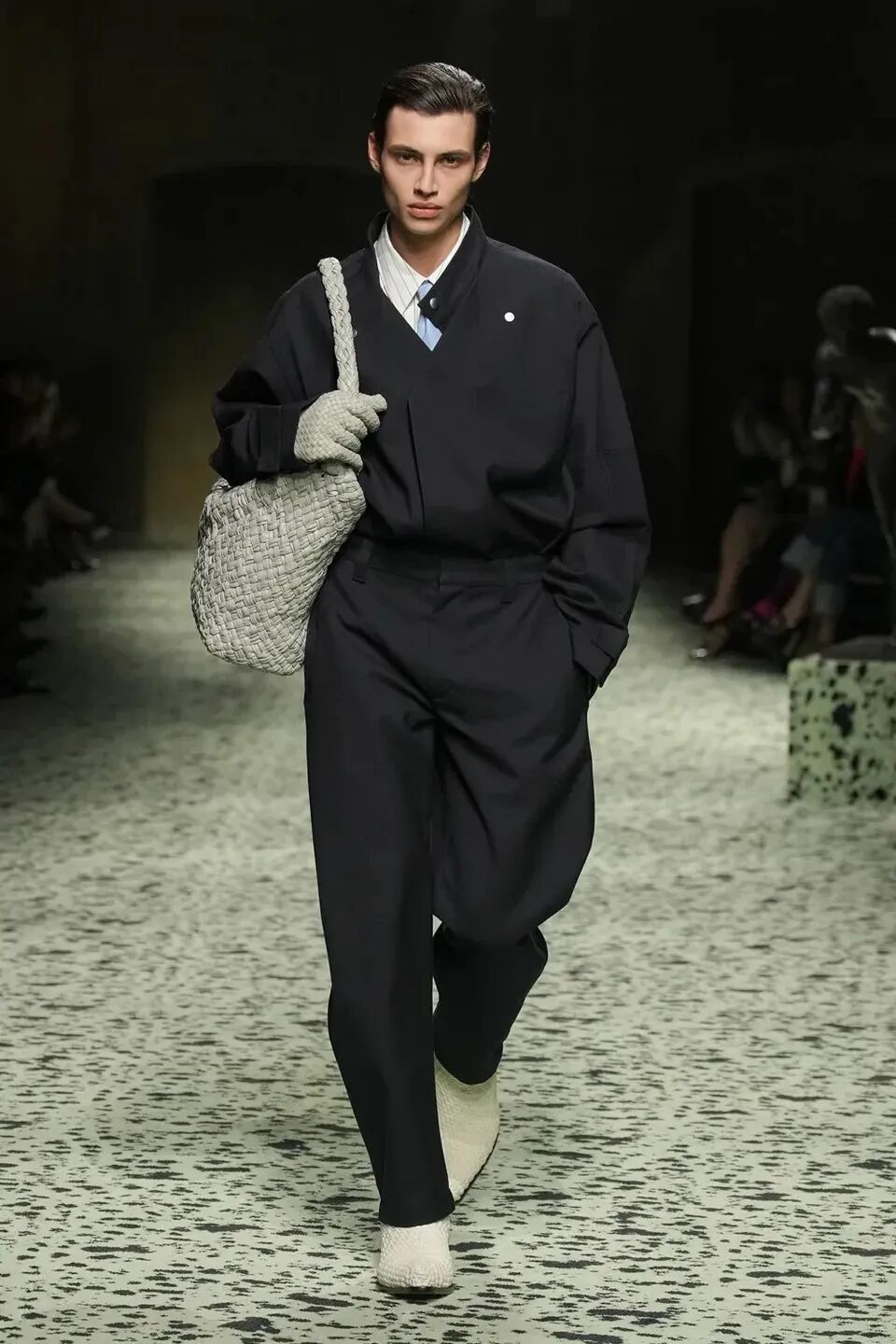 舒服的淡綠色地毯在秀場排開,裡面裝飾著古羅馬的青銅跑者,無不向精細考究的意大利手工藝致敬。