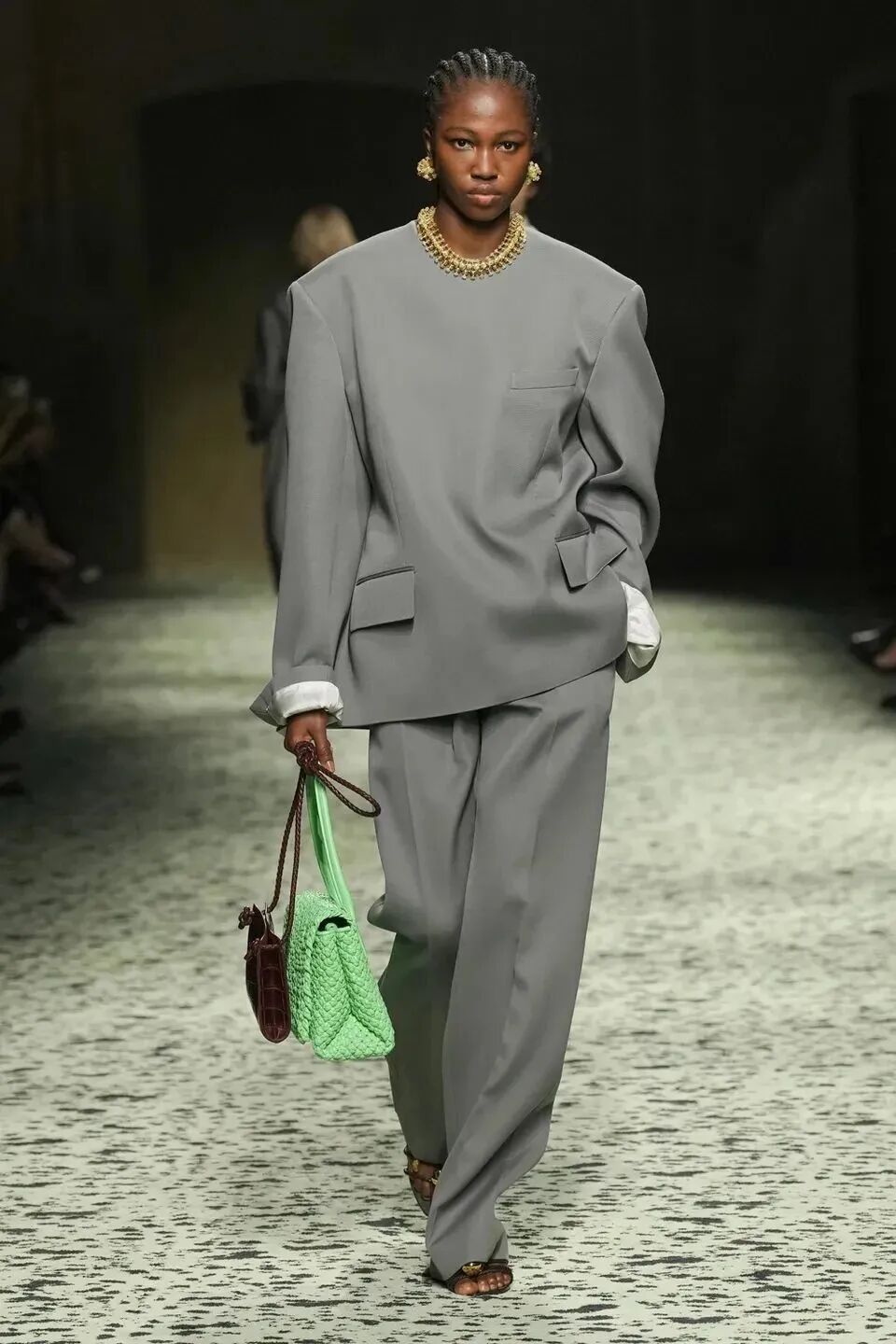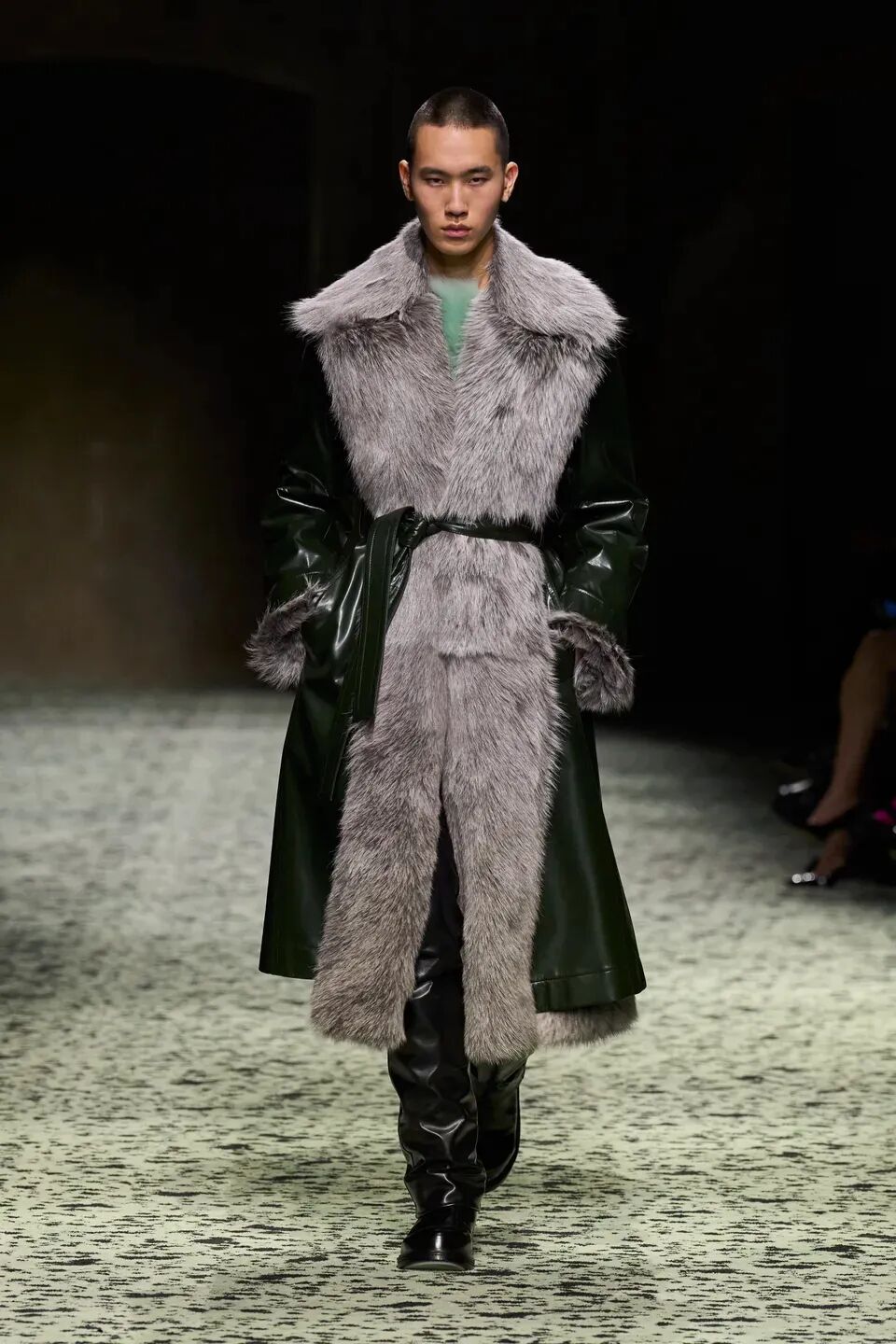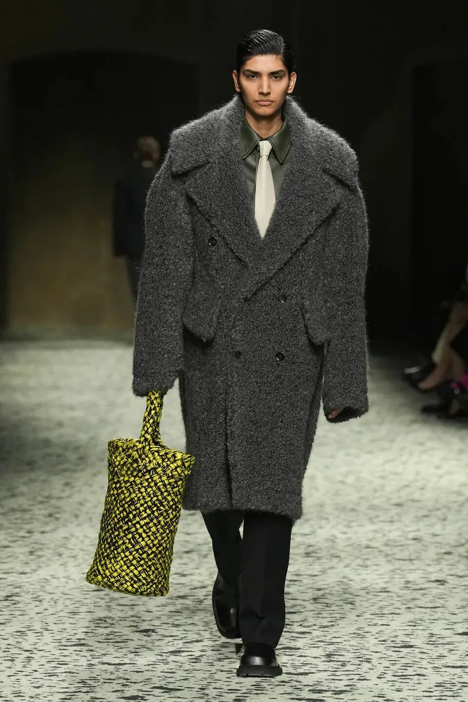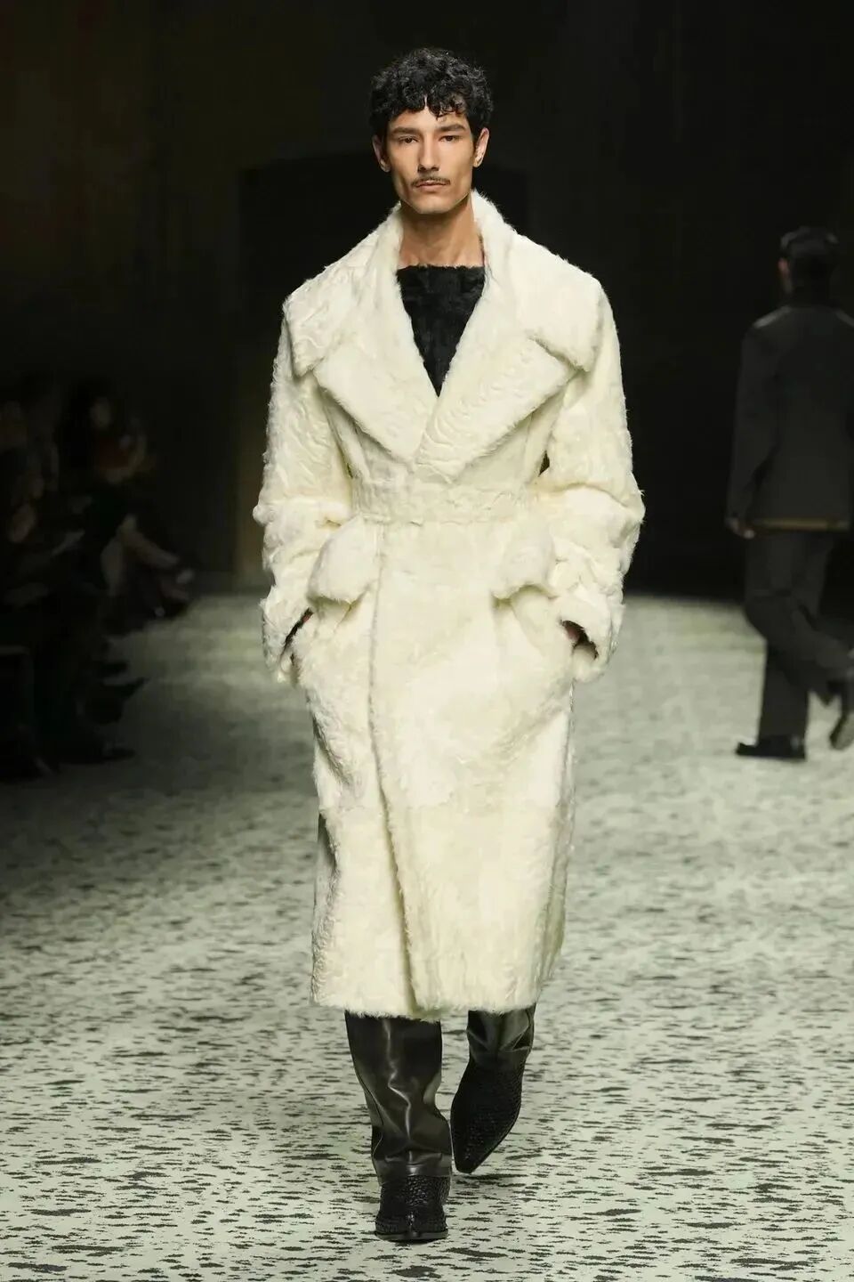 舒服的淡綠色地毯在秀場排開,裡面裝飾著古羅馬的青銅跑者,無不向精細考究的意大利手工藝致敬。