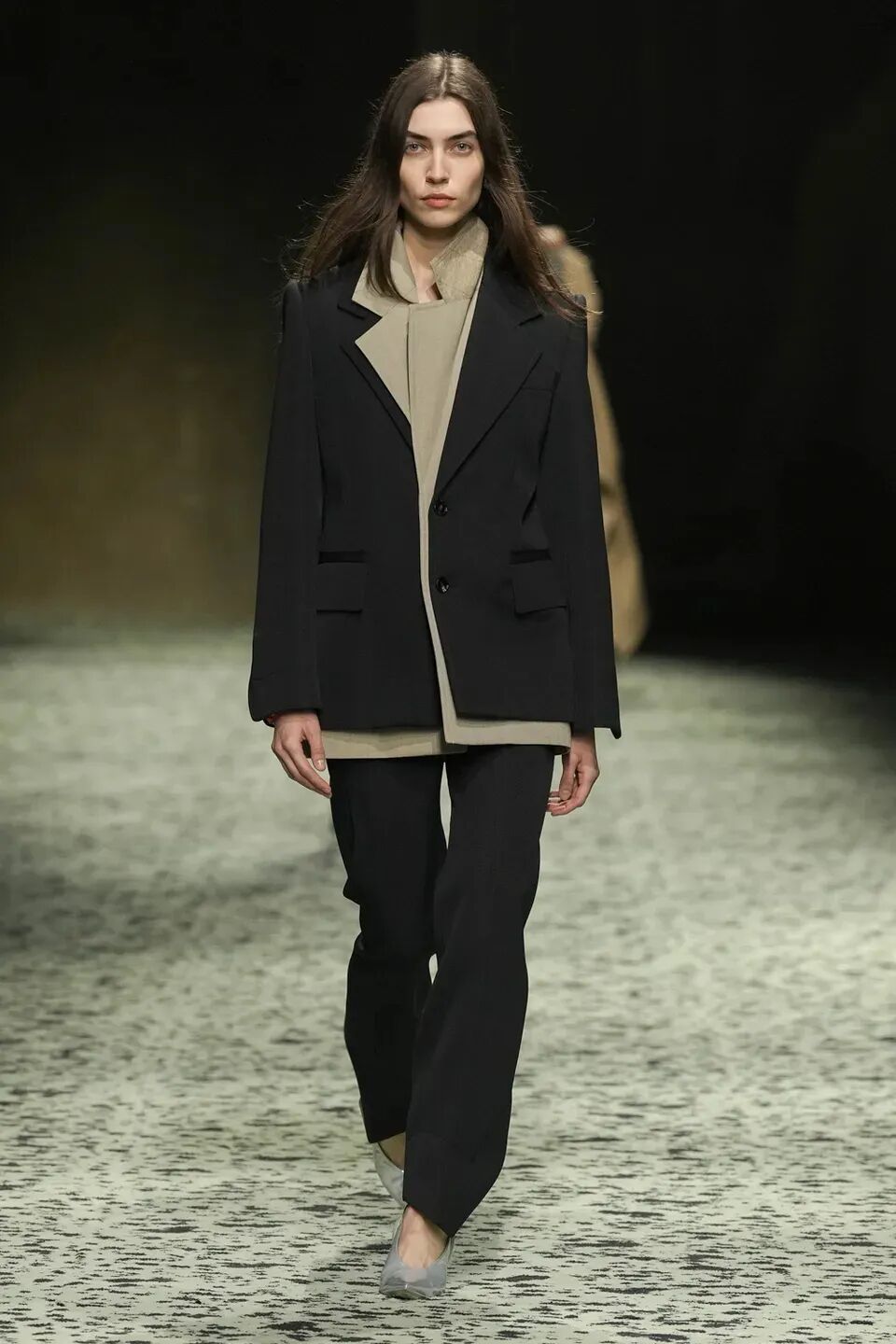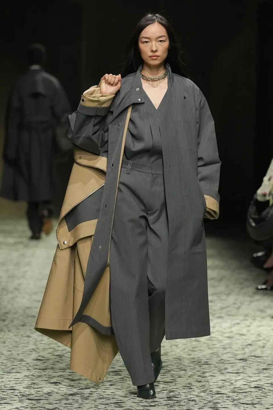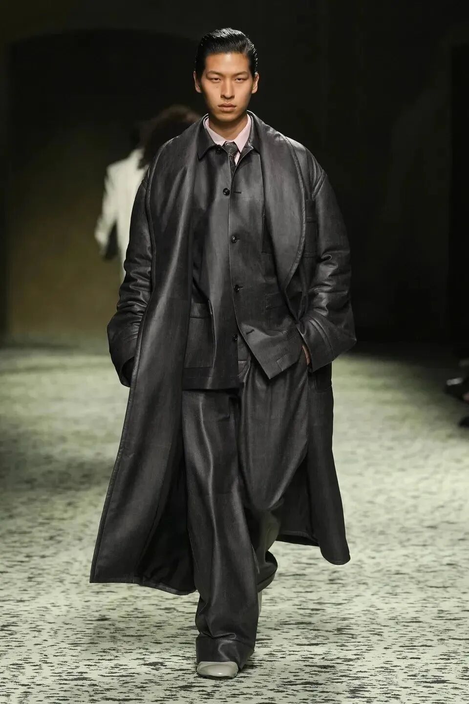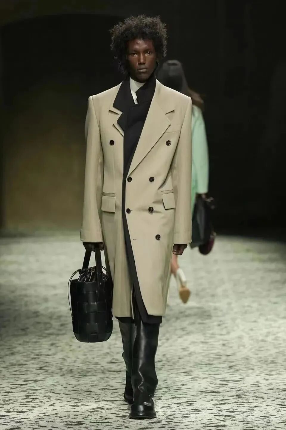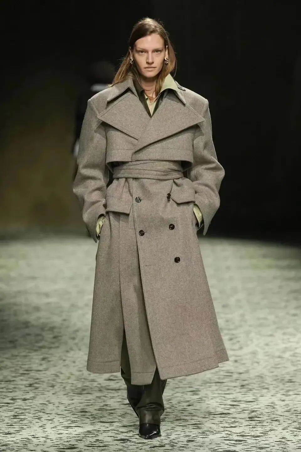 本場大秀進一步呈現了模糊男女裝的概念,卻又在其中做了更適合彼此的版型勾勒。硬挺的秋冬系列外套帶來強勢凜冽的氛圍感,男裝在墊肩位置突出氣勢磅礴的壓迫感,女裝則在腰部急速收攏,是略帶復古氣質的強勢。
