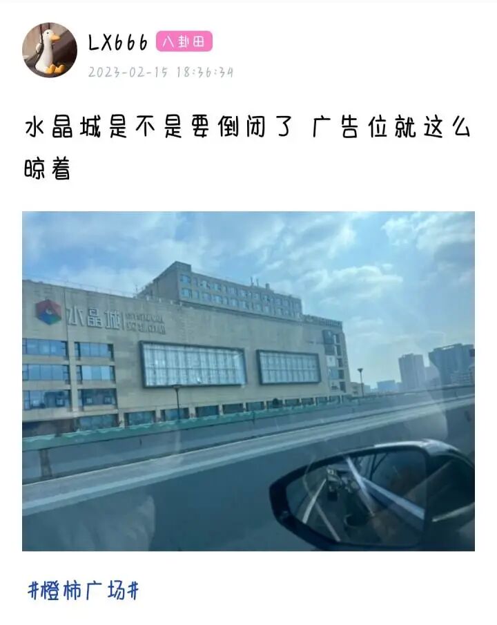 橙友@LX666發現得更早,2月15日他從高架上路過,發現商場兩塊廣告位都被“晾著”。他也發出了同樣的疑問:水晶城是不是要倒閉了?