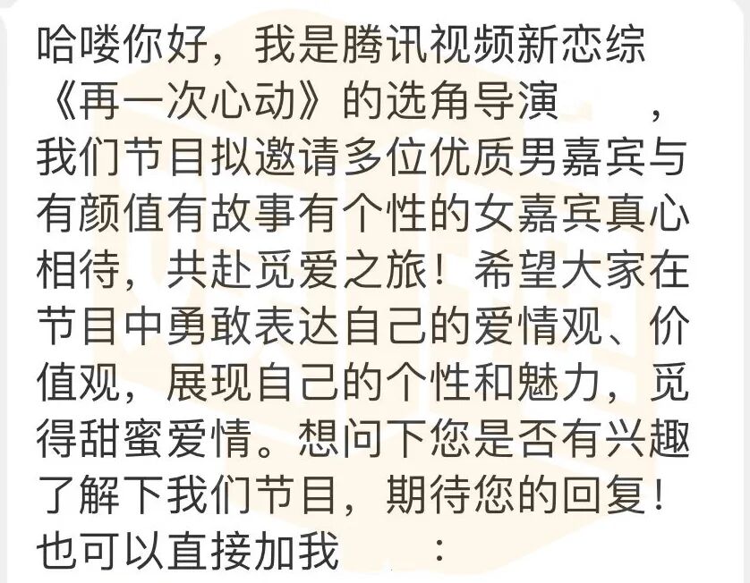 “哈嘍你好,我是騰訊視頻新戀綜《再一次心動》的選角導演,我們節目擬邀請多位優質男嘉賓與有顏值有故事有個性的女嘉賓真心相待,共赴覓愛之旅!”