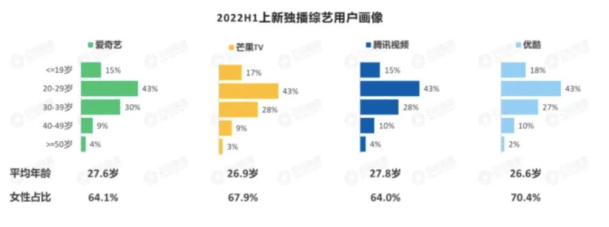 2022年上半年,四大平臺——愛奇藝、芒果TV、騰訊視頻、優酷——獨播綜藝的用戶畫像顯示,女性依然是絕對的主力軍,佔比從64%到70.4%不等。其中,優酷因接連上線多檔戀綜——《沒談過戀愛的我》《一起探戀愛》《怦然心動20歲》,導致其女性用戶佔比超過70%。