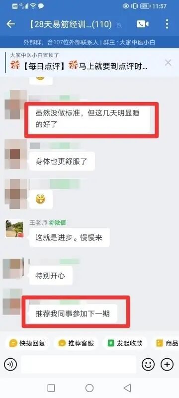 學員C:一位寶媽,邊上班邊帶娃,身體一直不舒服,經常熬夜,失眠問題嚴重,每天抽出自己的休息時間練習,“雖然動作沒做標準,但明顯感覺睡眠好了”,同時推薦了自己的同事來參加我們下一期的課程。