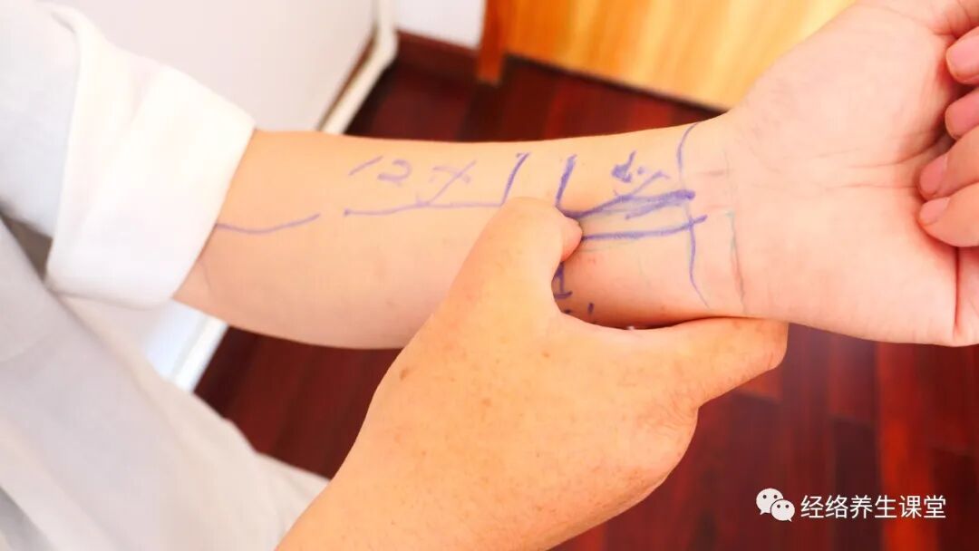 內關穴,在掌面腕橫紋中點三橫指,與我們握拳時,前臂靠手腕的中間有兩根很明顯的筋的交點處。
