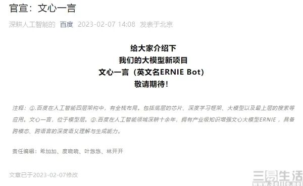 繼此前百度方面確認將推出類ChatGPT的人工智能產品“文心一言”後,日前有消息源透露,該產品首站或將落地百度搜索,且相關功能已陸續在百度搜索上線或內測,其中包括多答案回覆、智能生成等。據稱百度CEO李彥宏在2023年一季度個人OKR(目標和關鍵成果)內容中指出,其關鍵任務為“引領搜索體驗的代際變革”。在百度方面此前公佈相關信息顯示,文心一言又名ERNIE Bot,目前正處於上線前的衝刺準備階段,預計將在2023年3月完成內測後面向公眾開放。