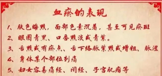①頭面表現:頭面處有斑,面色晦滯,眼眶暗黑,口唇紫暗,舌有紫色甚至瘀斑,舌下絡脈粗漲或紫黯。