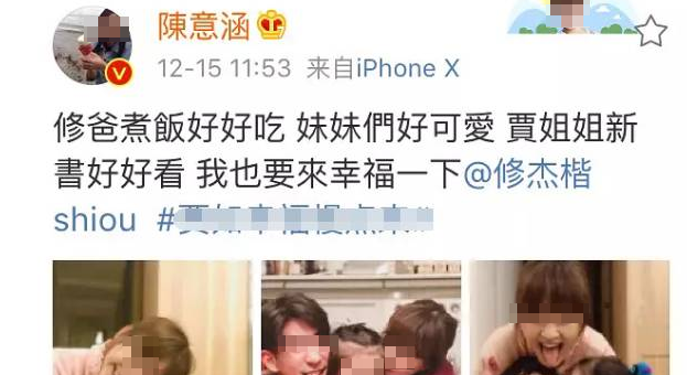 有一次,陳意涵到修杰楷家中吃飯,在微博上發出照片。