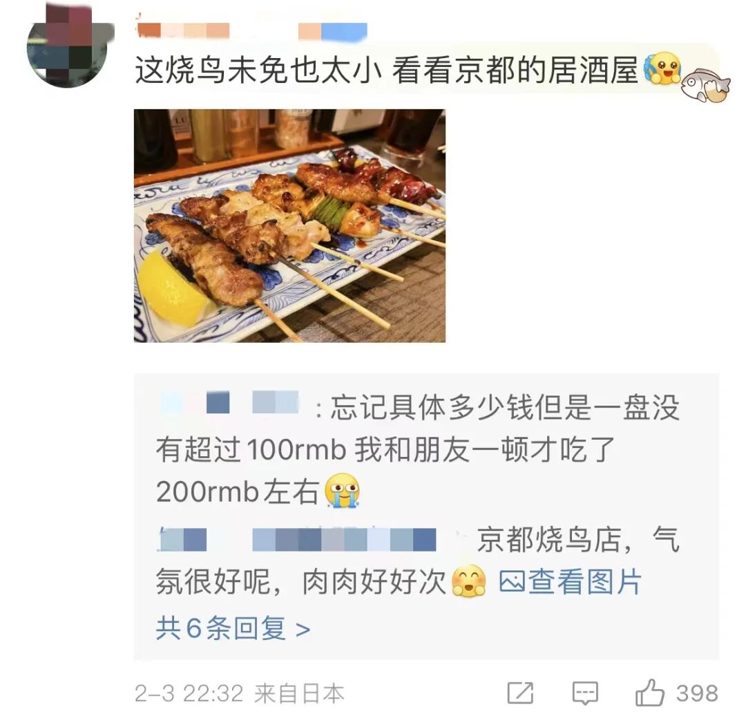 有人曬出了自己在京都居酒屋吃的燒鳥拼盤,肉串看上去又大又美味,而且這麼一大盤也沒有超過100元人民幣。