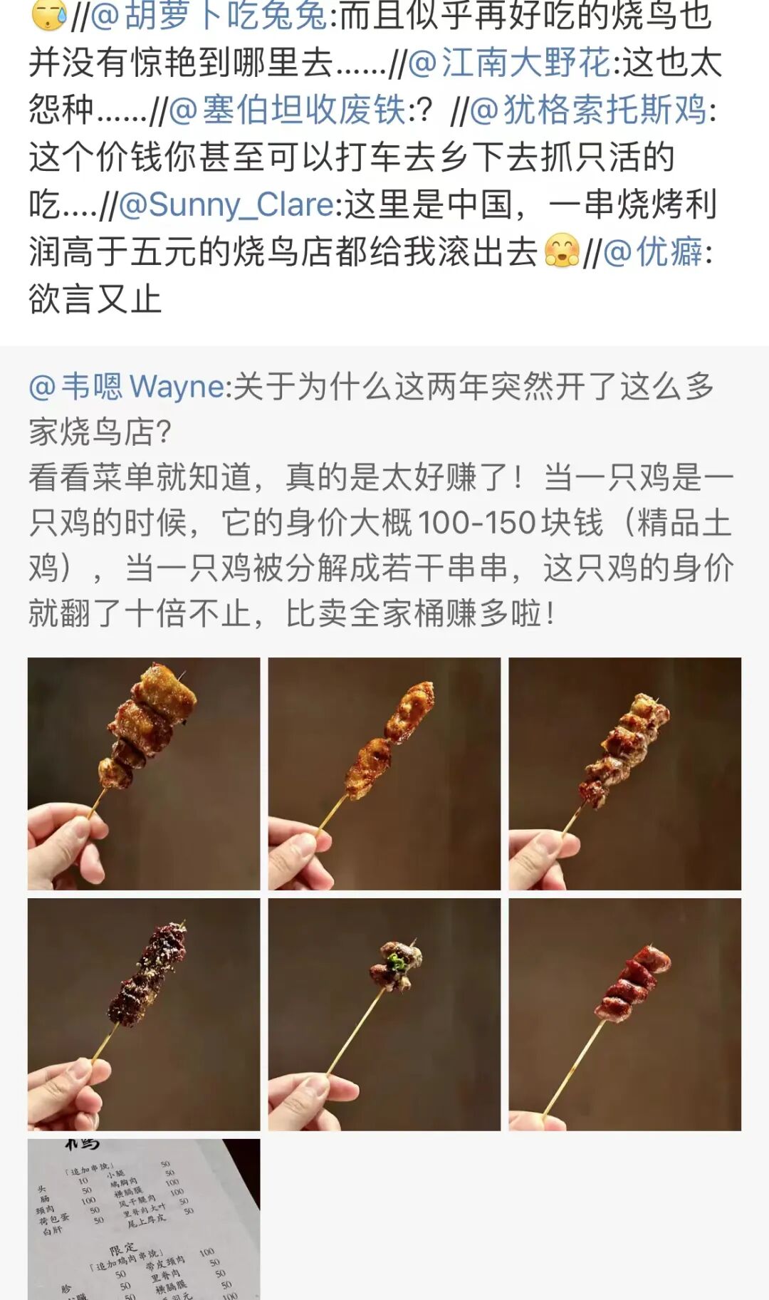 博主感慨:“為什麼這兩年國內突然開了這麼多家燒鳥店?看看菜單就知道,真的太好賺了!