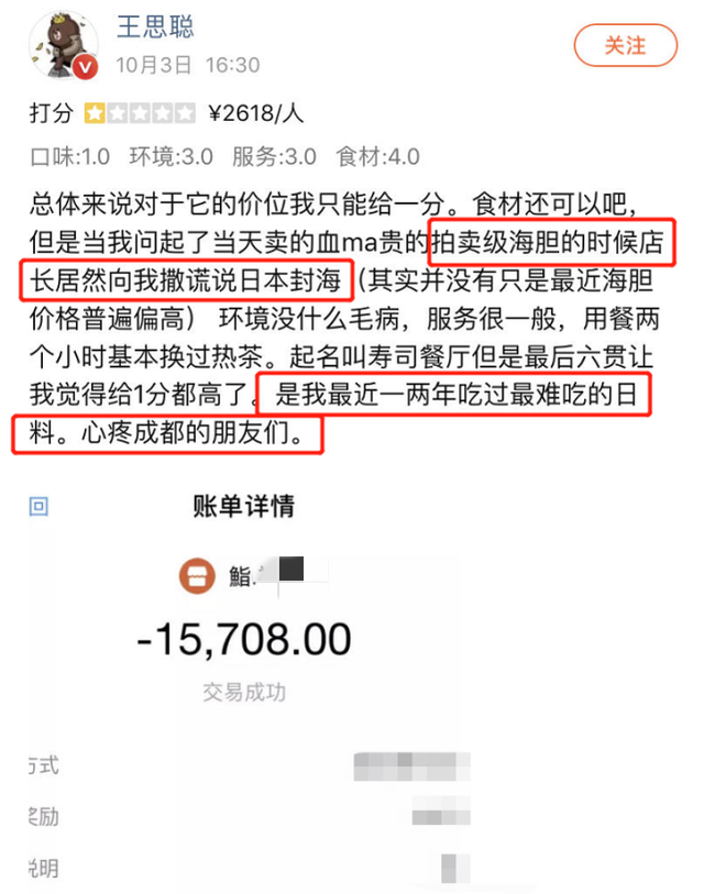比如,成都某高端日料店,被王思聰實名差評,稱其食材以次充好、味道難吃至極。
