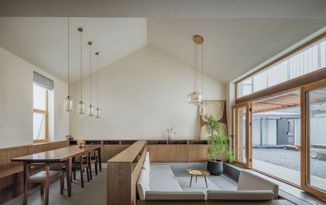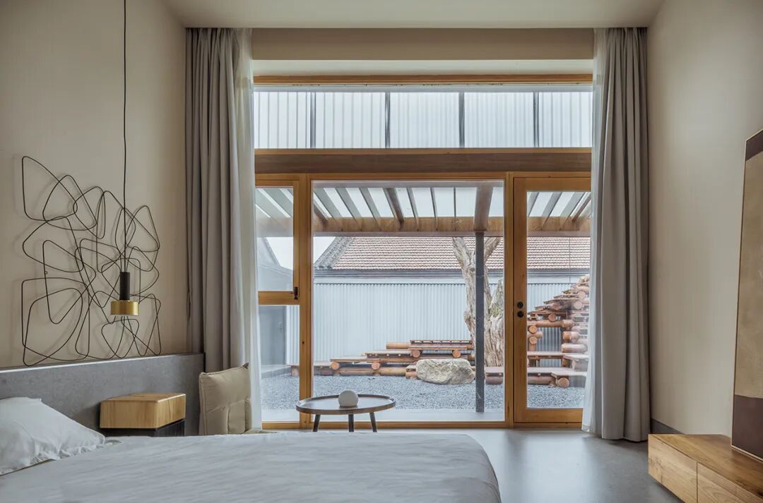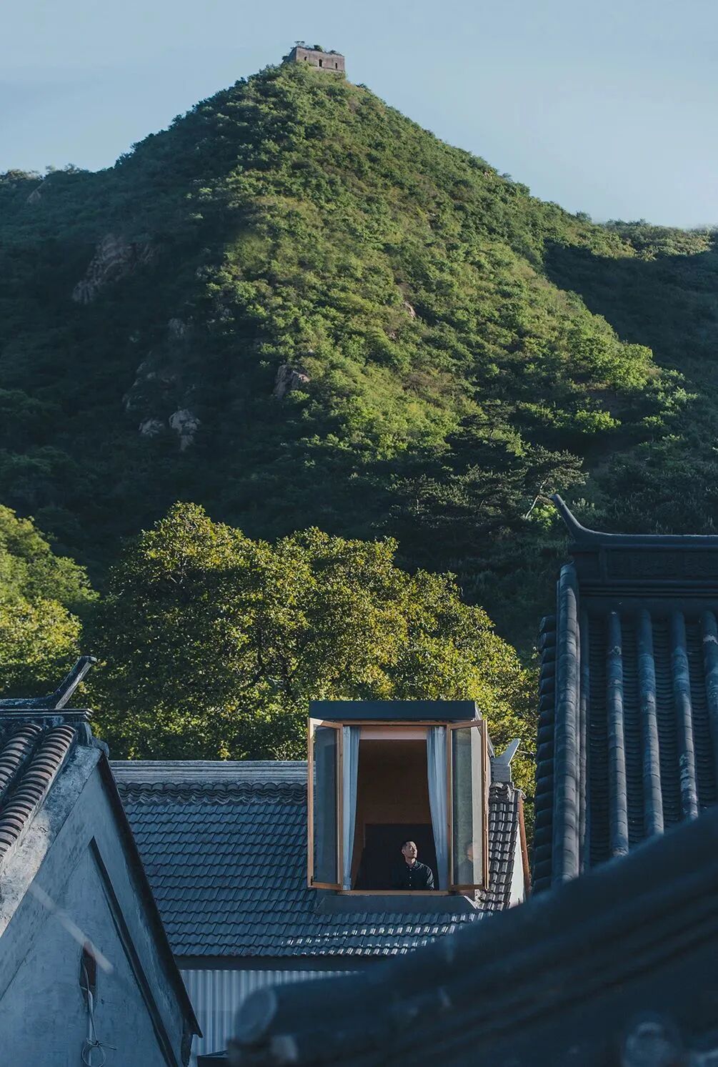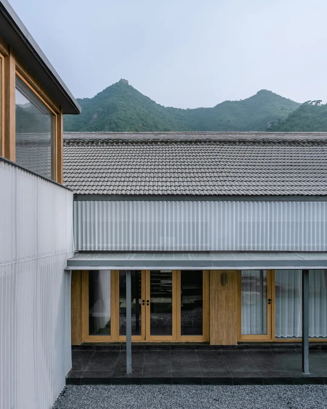 進入院內,原本院子有些空曠,於是便沿建築出挑屋簷,形成寬敞圍廊,形成一處可以靜坐其中的空間。而壓低的屋簷,一方面更為踏實,並且將室內視野上下劃分開,其上框景遠眺長城,其下實木開啟扇的溫度感與庭院更親近連接。