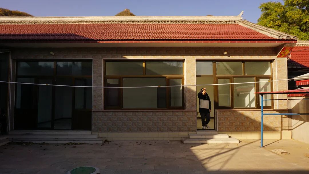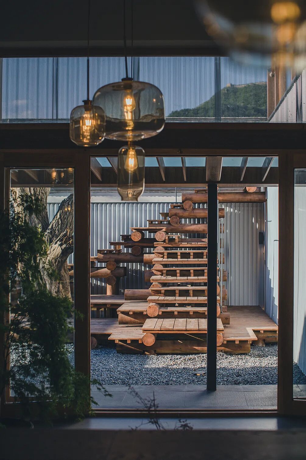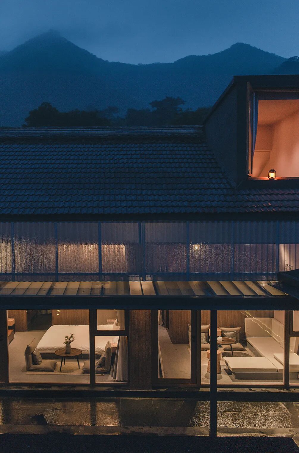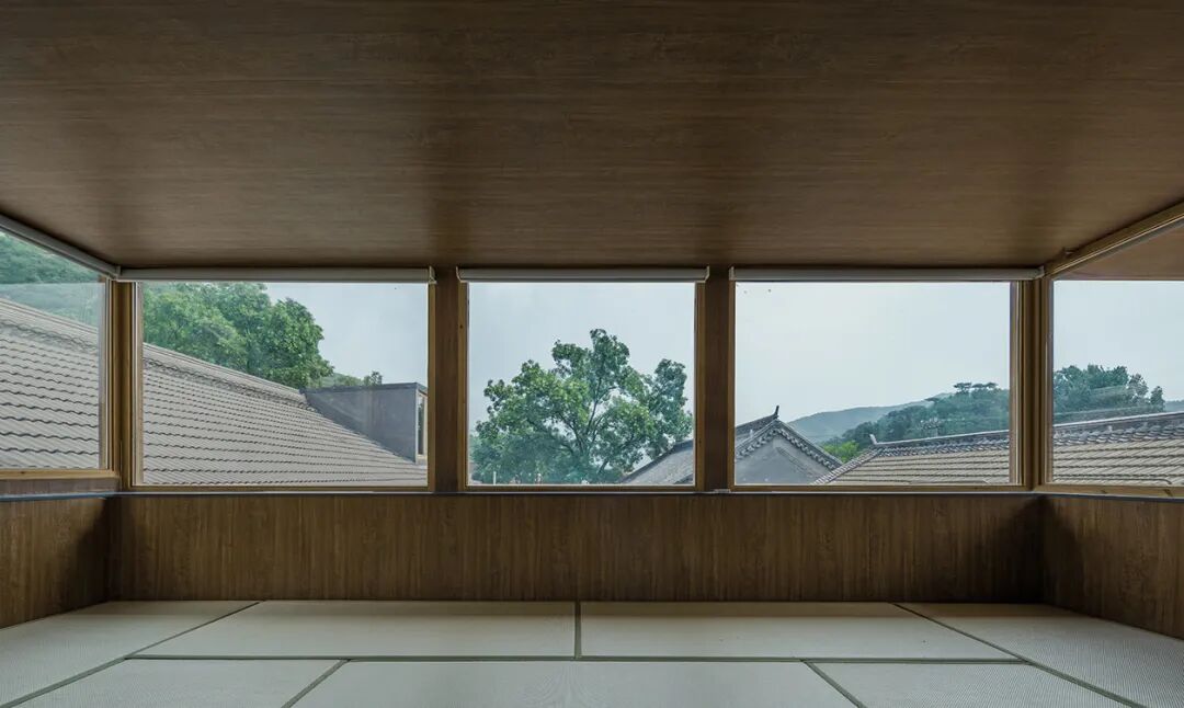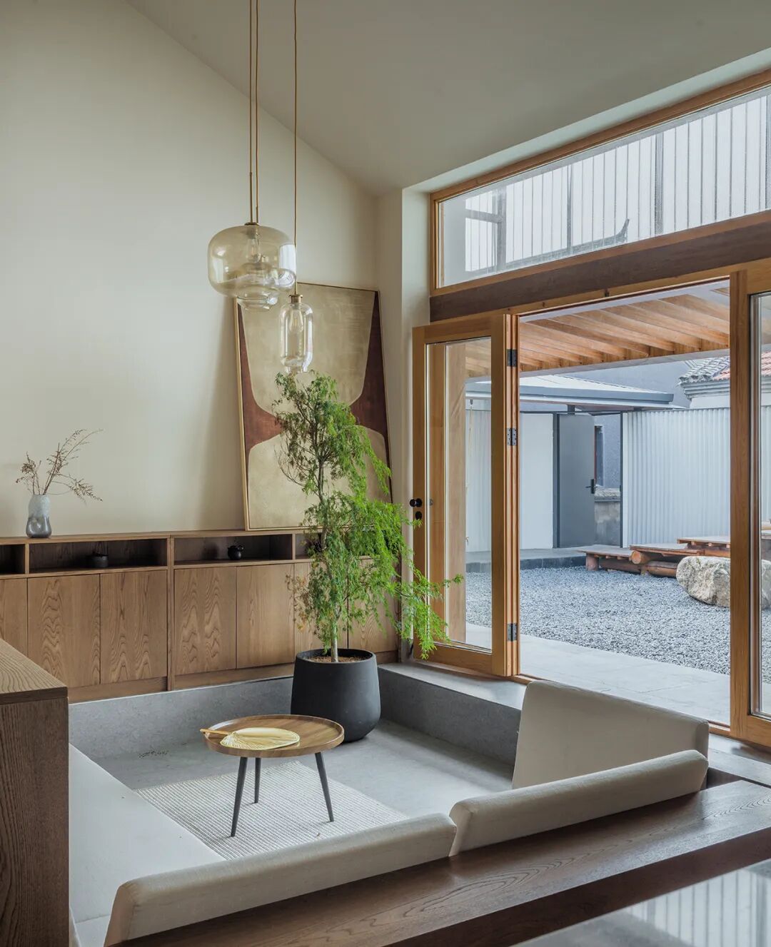 進入院內,原本院子有些空曠,於是便沿建築出挑屋簷,形成寬敞圍廊,形成一處可以靜坐其中的空間。而壓低的屋簷,一方面更為踏實,並且將室內視野上下劃分開,其上框景遠眺長城,其下實木開啟扇的溫度感與庭院更親近連接。