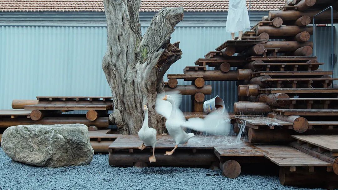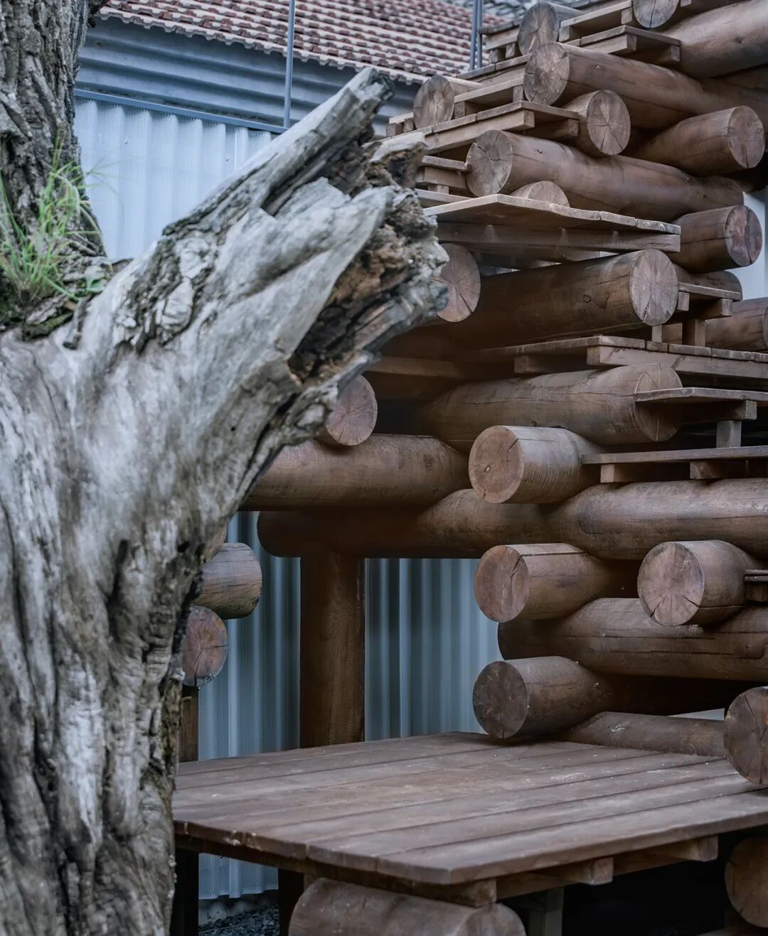 圓木的截面在視覺上總還是有滾動的動勢存在,一腳踏上去,聽到木頭嘎吱作響,心頭不免一驚。而在下樓梯的時候,不安的感覺更甚。漸漸老化的木頭模糊了階梯的邊界感,無法輕易邁步落腳,這倒也消解了怕人跌落摔傷的顧慮,因為“危險”的提示,使人們不得不專注在眼前唯一的事情上,全神全情的魅力在此刻便被拾起。木板間的交疊似乎形成了某種混響,走在上面發出堅實硬朗的踏步聲,而人們大多會選擇靜靜的坐一坐,望一望,“鷂子落”。