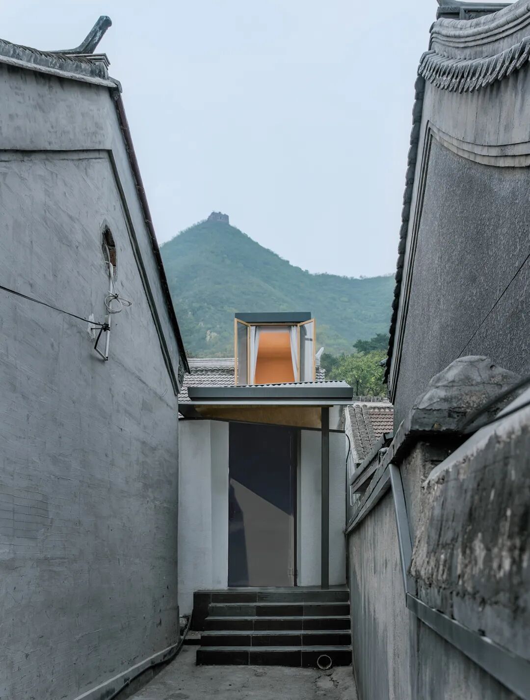 窄巷盡頭,便是院落門口,門後建築屋頂架起一座小小的閣樓將視線拉到高處,與山上遙遠的烽火臺形成新舊之間的對話。傍晚,粉色內牆所映射出紅色的光,照的閣樓如燈,懸於院門口與烽火臺之間,溫暖的等待著。