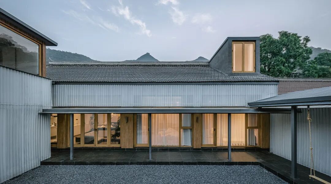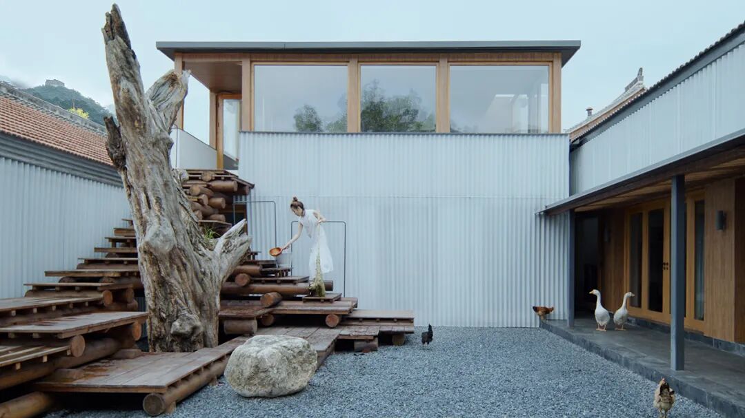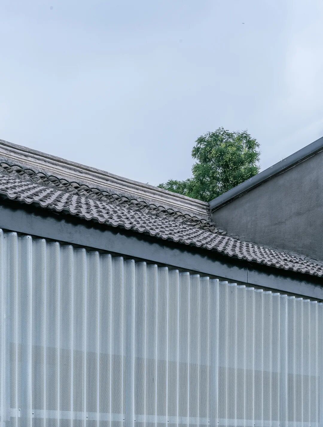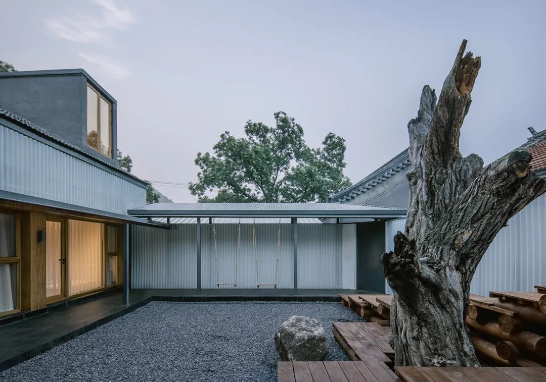 站在庭院內環顧四周,銀色的波紋板包裹著房屋面向院子的界面,塑造出寧靜的空間氛圍。波紋板自身均勻起伏的紋理形成視覺節奏,為空間添加一份不易察覺的秩序感,院外雜亂無章的村落被隱於建築之外。