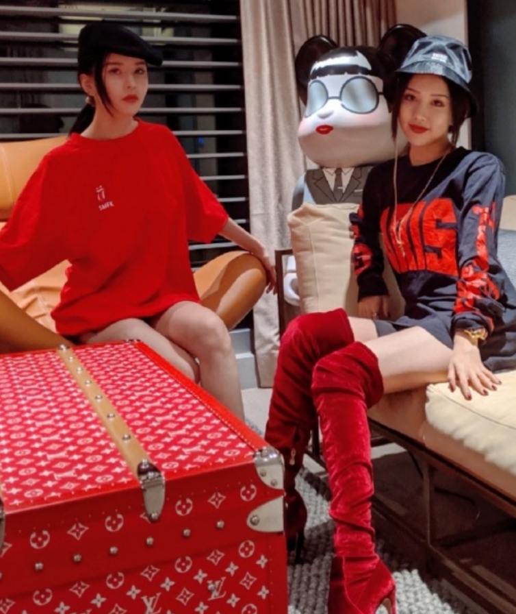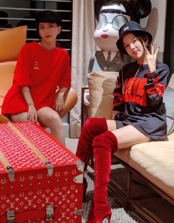 兩人的穿搭看起來都特別的顯眼,左邊的姐姐身穿了一件紅色的T桖,這件T桖的款式看起來是比較顯眼的,大紅色的顏色搭配看著特別的吸睛,而右邊妹妹則是穿了印花的衛衣搭配,很有時髦感。