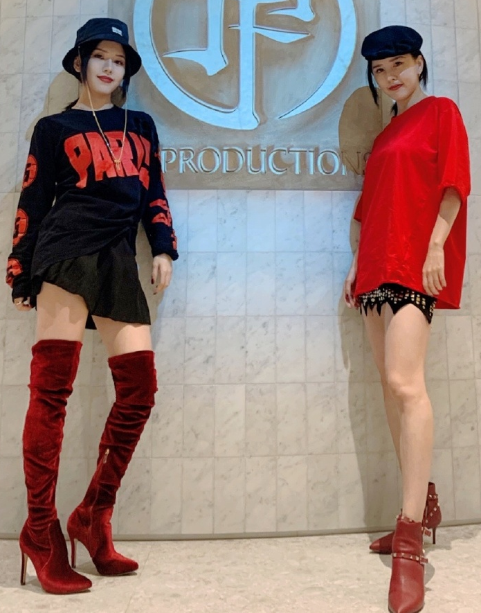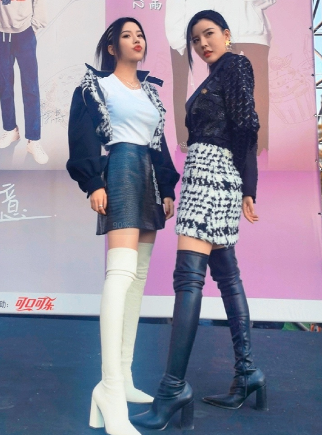 兩人都同穿了一雙靴子,靴子的長度都不一樣的,但是穿出來的效果都很好,她們像得連電棍腿都一樣,看起來特別的搶眼。