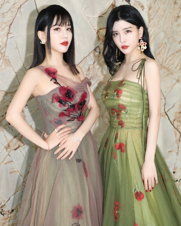 by2的這身造型也是十分驚豔的,她們兩人都穿了一條長款的禮服,這條裙子的設計是很精緻的,綠色和暗紅色的顏色搭配,看起來特別的吸睛,而且裙子上面是雪紡紗的面料設計穿後很有夢幻的感覺。
