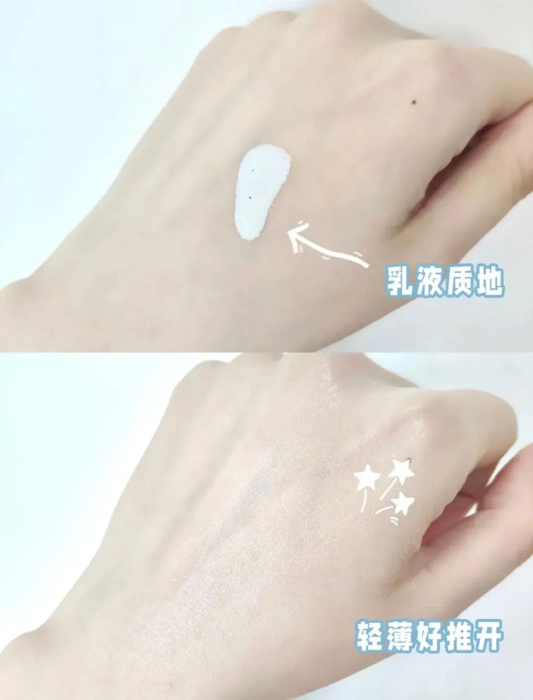 它厲害的地方在於,雖說是有高防曬力,但不會影響膚感。它被我稱為“塗完後最漂亮”的防曬因為有一點潤色效果,皮膚看起來白嫩勻淨很多,而且一點都不油膩,就像塗了一層乳液一樣。後續無論和什麼底妝疊加,都不會搓泥起皮。