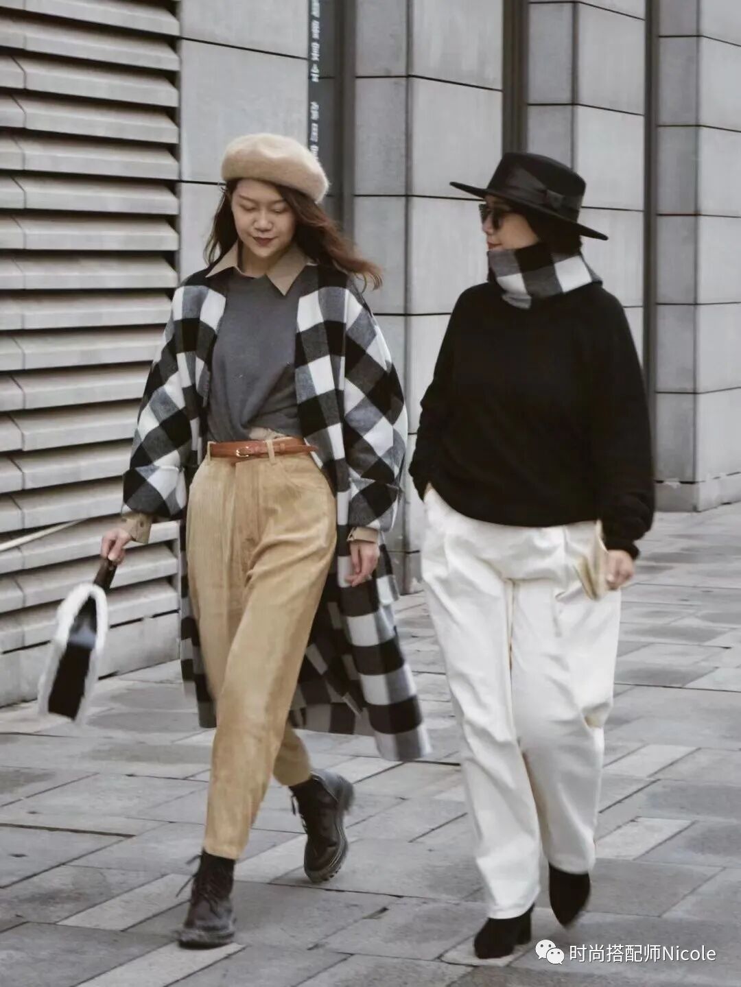 錐形褲、打褶闊腿褲都是屬於腹部、胯部很寬鬆的褲型,對於媽媽們的身材很友好,可以像上面這個媽媽一樣選擇一條高腰的錐形褲加上修身深色上衣,上面修身下面寬鬆,非常的顯瘦。