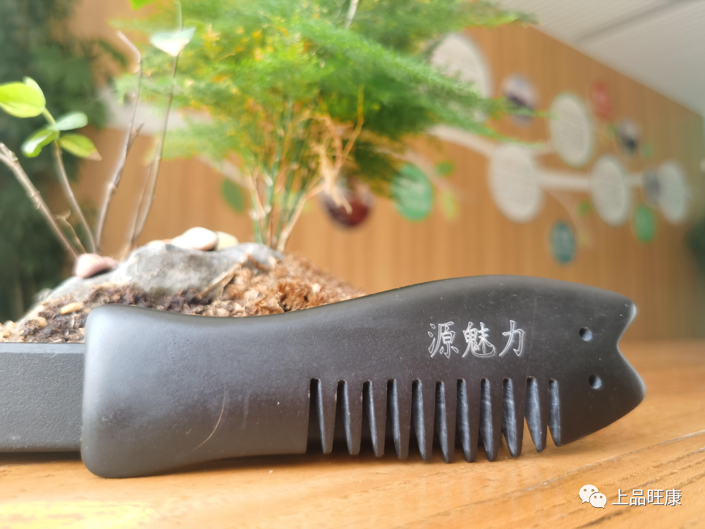 整個工具呈魚型設計,最大限度減少了操作時更換工 具的頻率,魚尾處可以深層疏通耳下淋巴;魚背處可 以用來做淋巴排毒;魚頭處可以用作點穴;魚嘴處可 以刮上下眼眶以及耳廓部位;魚齒則可以用來疏通頭 部經絡。