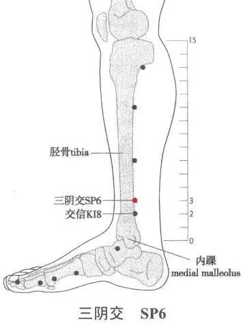 三陰交:內踝高點上三寸,脛骨內側面後緣